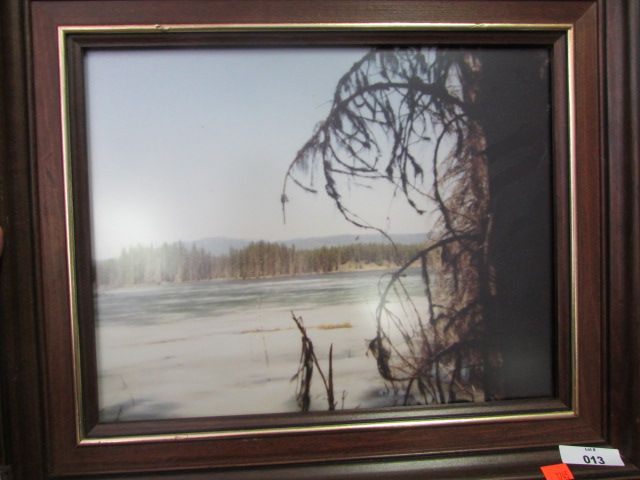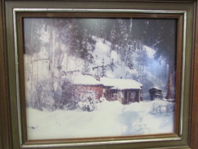 LARGE GUILDED FRAMED PICTURE - FLOWERS and FRAMED PICTURE - LAKE and FRAMED PICTURE - SNOWED IN CABIN - 3 TOTAL