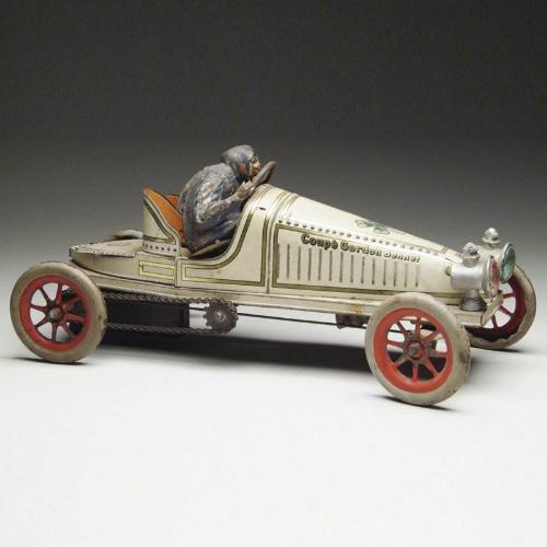LARGE GUNTHERMANN GORDON BENNET RACECAR. Wow!! Fresh out of New England attic, this fabulous early lithographed racer with tin balloon tires, features two exaggerated hand painted crouched figures with aspirations of being the first to cross the finish line. Believed to be the best known and most sought after of all Gunthermann cars. Clockwork mechanism with chain driven wheels. Two large die cast headlamps in green and red grace the front end with a 4-leaf clover lithographed on the hood. Also marked on front "5" and "Coupe Gordon Bennet on both sides of hood. Gunthermann logo appears on tail of racer. SIZE: 12-1/4" l. x 4-3/4" w. CONDITION: One of the finest to turn up. All original and in near excellent condition with strong lithography. Couple small scratches on hood with minor flaking to figures, and usual edge wear to tires. It lacks only the diecast horn (usually missing) and the spare rubber tire. A truly exquisite example of fine German craftsmanship. 1-4731 MC