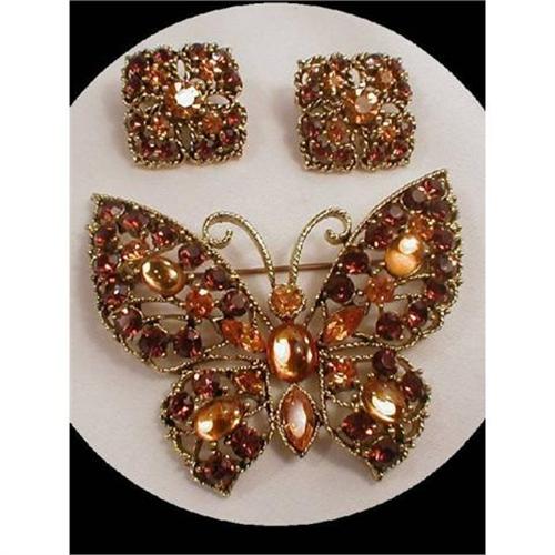 This gorgeous set is from the 40-50's and is in great condition.The butterfly is quite large ( almost 3" wide ) and the earrings are 1". The colors are rich golden topaz color glass and the filigree is quite fancy. Looks like it was never worn.