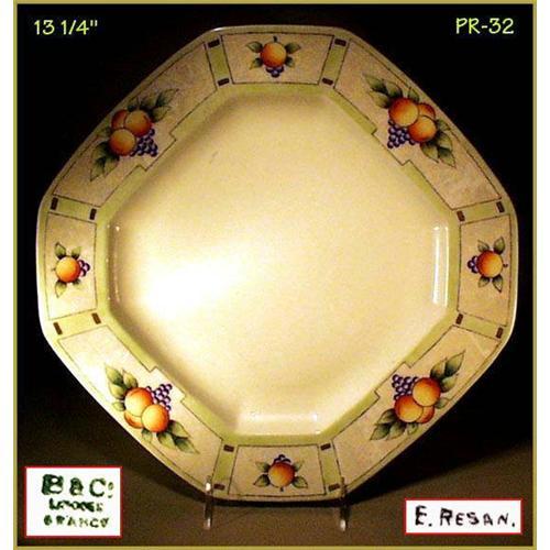 This is gorgeous hand painted porcelain platter from the 1900-20 period. This lovely piece has peaches and grapes decor with satin gold bars in the corners. The base is marked B&Co., Limoges France and signed by the Artist - E. RESAN. Dimension : 13 1/4 inches across the widest point. Very good condition, no chips, cracks or repairs.Some photos are automatically reduced, so if you need to see larger, more detailed pictures or more photos we may have, please email us ()