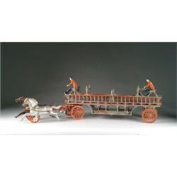 LARGE HOOK & LADDER BY IDEAL. The hook and ladder on this toy is nickel-plated and is embossed “IDEAL FIRE DEPARTMENT” on either side. Red enameled spoke wheels, iron buckets and axes, and red wooden ladders are accessories included. Two firemen sport red jackets, blue pants, black hats and shoes, and flesh-toned faces and hands. Two large horses, one brown and one silver, both in gold trappings, are galloping—as is illustrated by their flowing manes and tails—towards their destination. This is one of a set of three pieces that all came from their original owner. These highly sought-after Ideal toys are among the most realistically cast replicas of their time period. SIZE: 32”. CONDITION: Overall condition is excellent. MC 1-3990 (3,000-4,000)