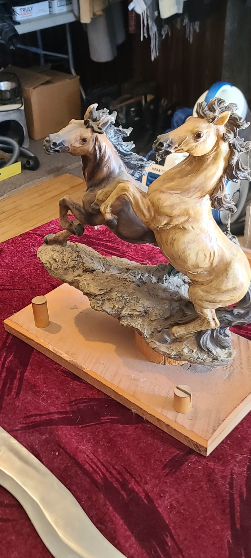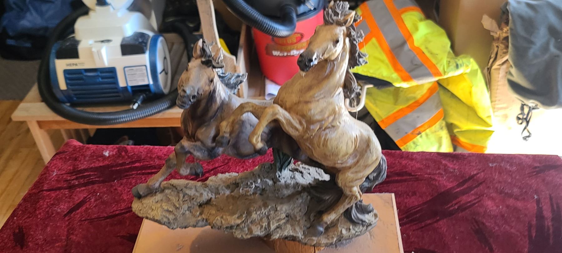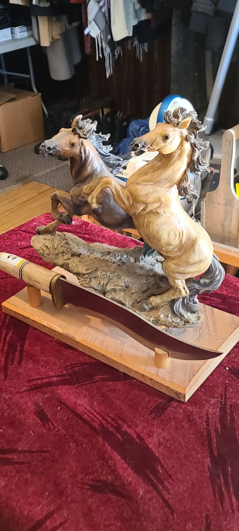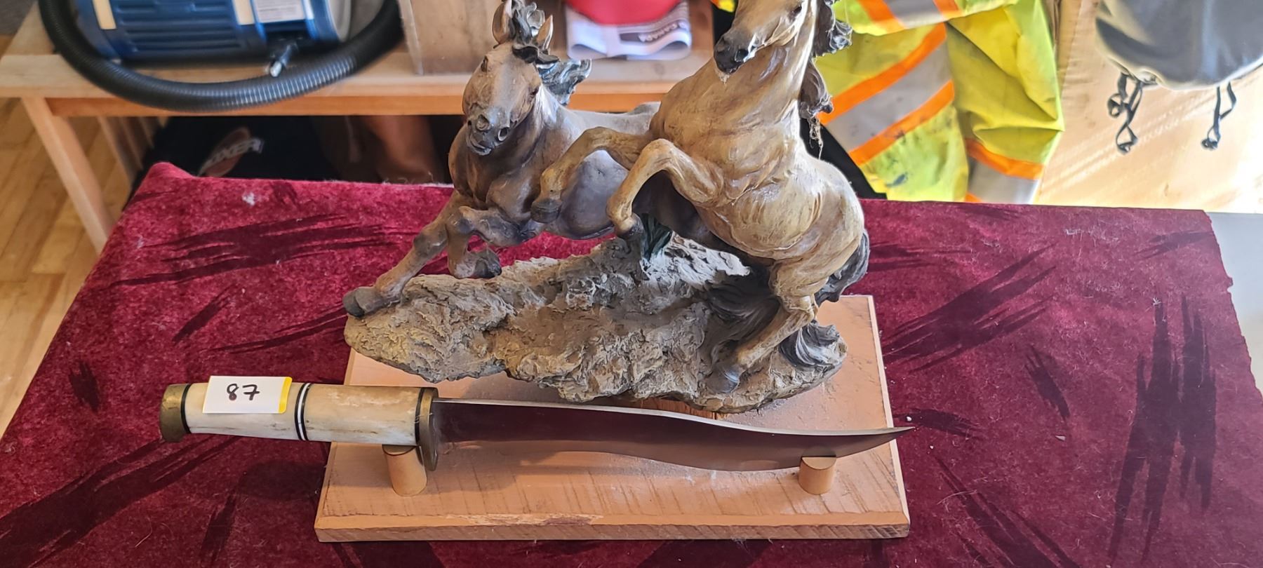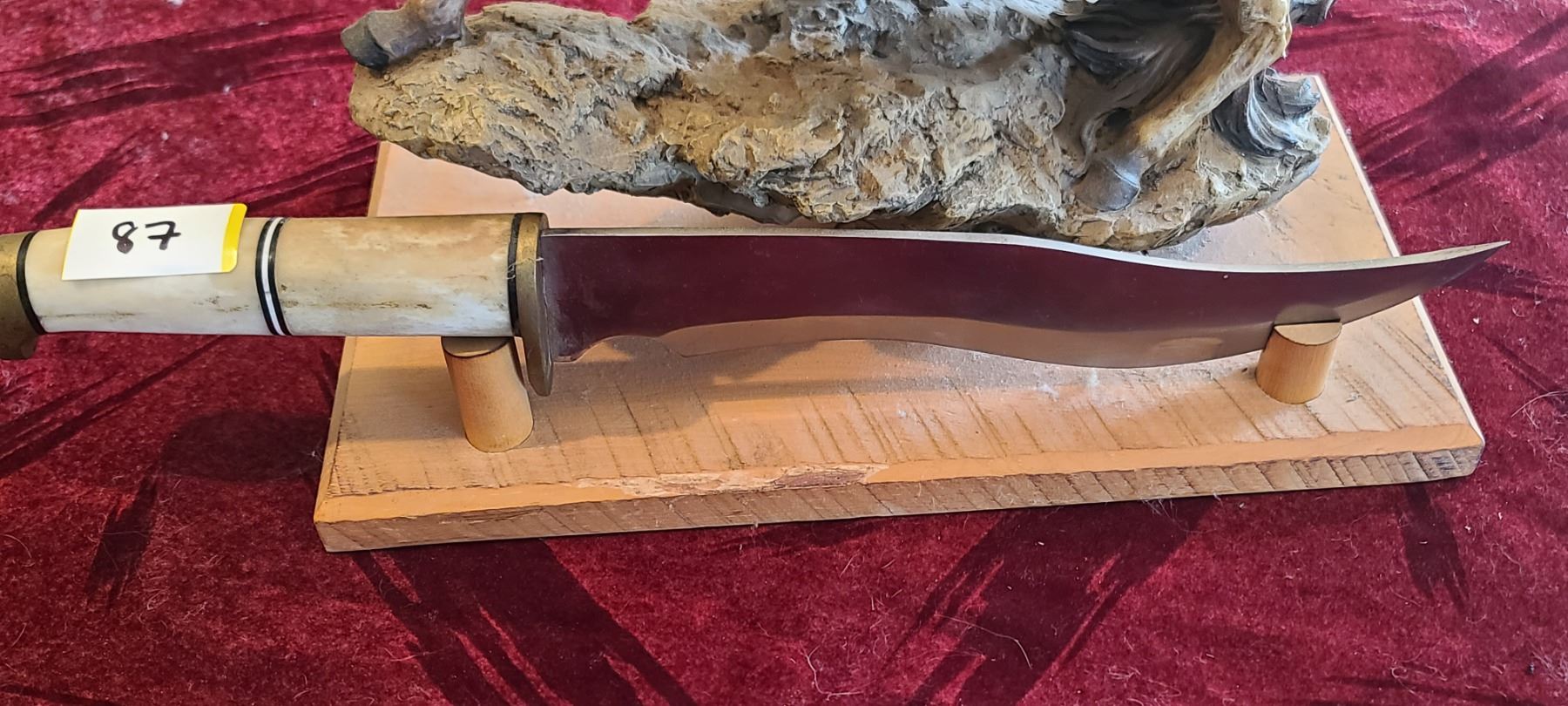 LARGE HORSE SCULPTURE WITH LARGE BOWIE KNIFE C/W BONE HANDLE