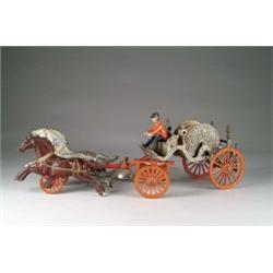 LARGE HOSE CARRIAGE BY IDEAL. This ornately cast hose reel is nickel-plated and boasts its original hose. The red enameled spoke wheels are pulled by two large horses, one brown and one silver, both in gold trappings, and are galloping—as is illustrated by their flowing manes and tails—towards their destination. The fireman sports a red jacket, blue pants, black hat and shoes, and flesh-toned face and hands. This is highly sought-after because of its rarity and realistic castings. SIZE: 21 1/2”. CONDITION: Overall condition is excellent, minor wear to silver horse and some discoloration on the nickeling behind the rear wheel. MC 1-3987 (3,000-4,000)