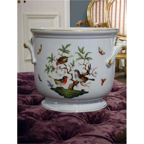 This large, impressive Herend cachepot features the enchanting Rothschild bird motif. The enchanting hand-painted scene depicts songbirds in a tree playing with Baroness Rothschild?s lost jeweled necklace. Hand-painted butterflies and insects add further decorative effect.