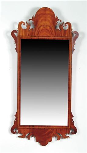 LARGE INLAID MAHOGANY CHIPPENDALE MIRROR. Tall scroll carved crest with line inlay rectangular frame. Nice mahogany veneers. SIZE: 51-1/4in. l x 25: w. CONDITION: Very good, some old repairs. 9-26138