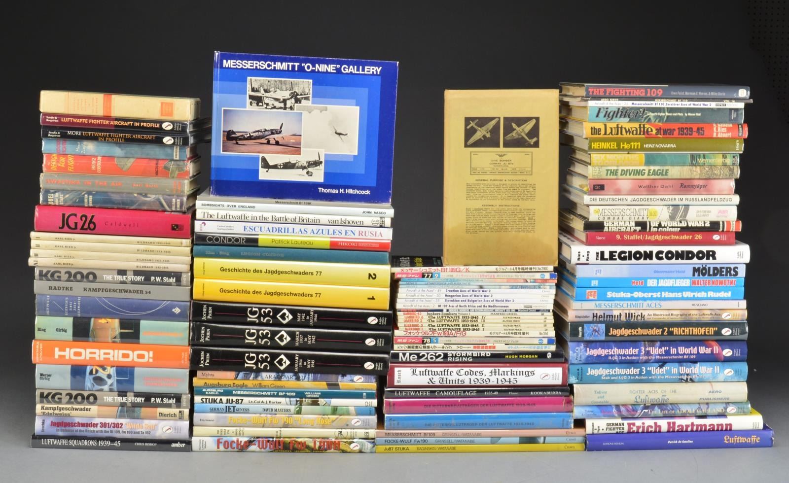 RELATING TO WWII GERMAN LUFTWAFFE Unique reference materials for military historians & modelers. Books on aircraft types & unit histories plus biographies. Publishers include: Schiffer, Motor Books International, Squadron/Signal & Osprey. Group contains approx. 70 each of hard & soft cover volumes. Group also contains approx. 50 issues of The Military Advisor Magazine published by James Bender publications between 1989 & 2003. Notable titles include: 2 volume set "Aireview's German Military Aircraft in the Second World War" in Japanese / 3 volume set "J.G. 53" by Prien / "Luftwaffe Codes, Markings & Units" by Rosch / "The Legion Condor" by Ries & Rink / "Condor" by Laureau / "Focke-Wulf 190A" by Herman Leverenz & Weber / "Me262 Stormbird Rising" by Morgan / "K.G. 200" by Stahl / "Luftwaffe Squadrons 1939-45" by Bishop / "J.G. 2 “Richthofen” by Nauroth / "German Jet Genesis" by Masters / "Rocket Fighter" by Ziegler. Biographies include: volumes on prominent individuals such as Galland, Hartmann, Molders & Rudel. Majority but not all volumes are in English; some in German, French & Japanese. CONDITION: ranges from good to very good w/ some near excellent. (02-14518/RW). $700-900.