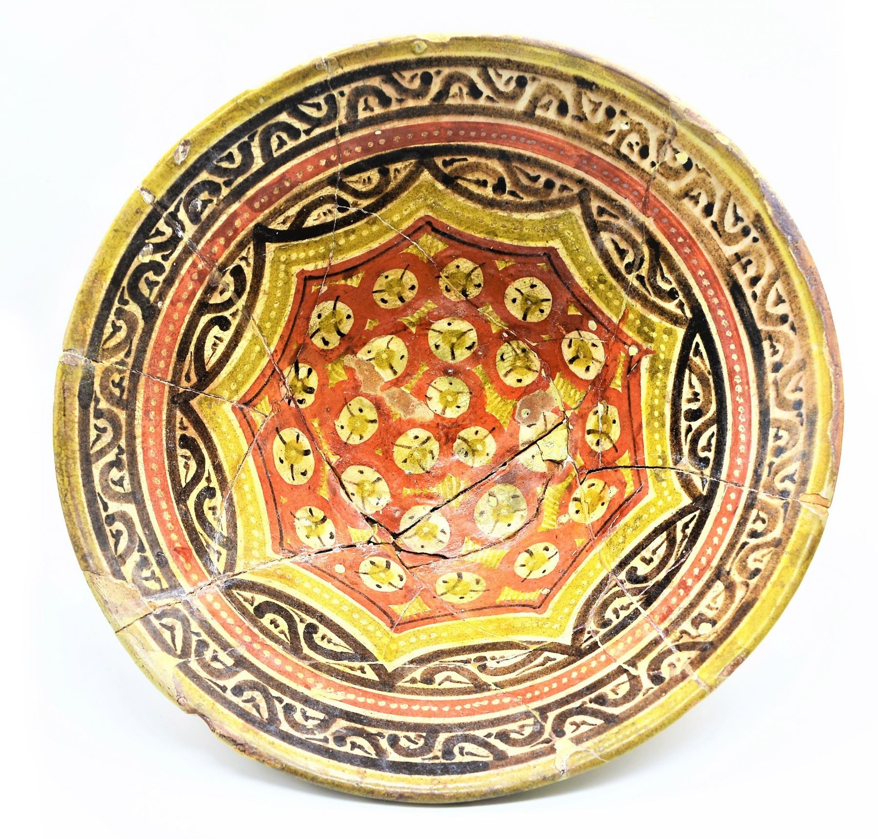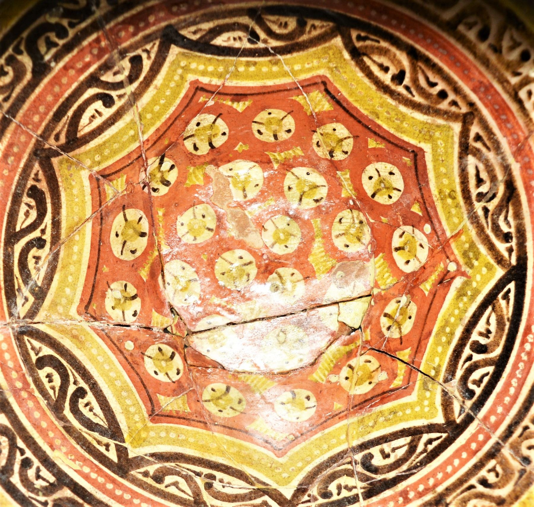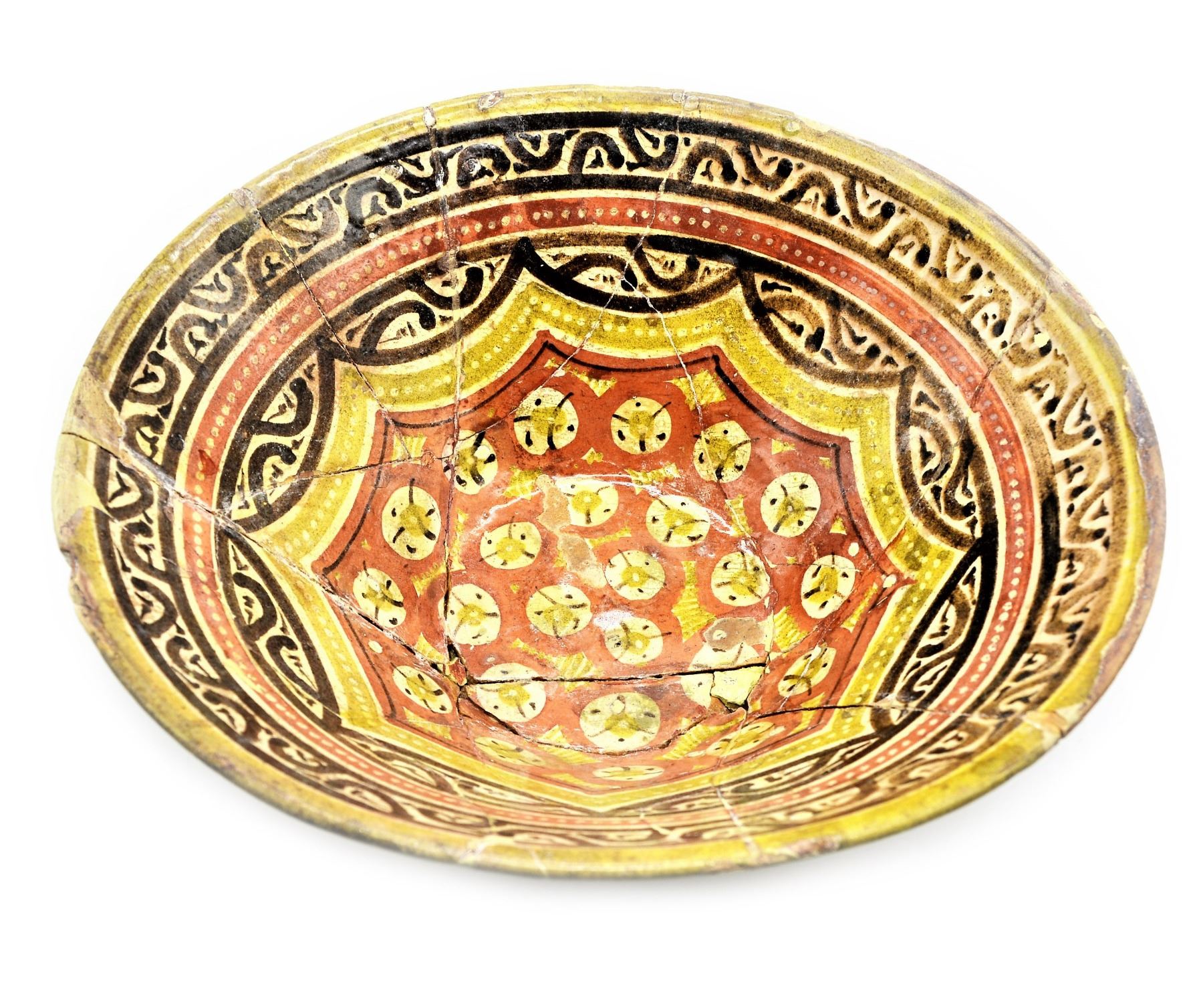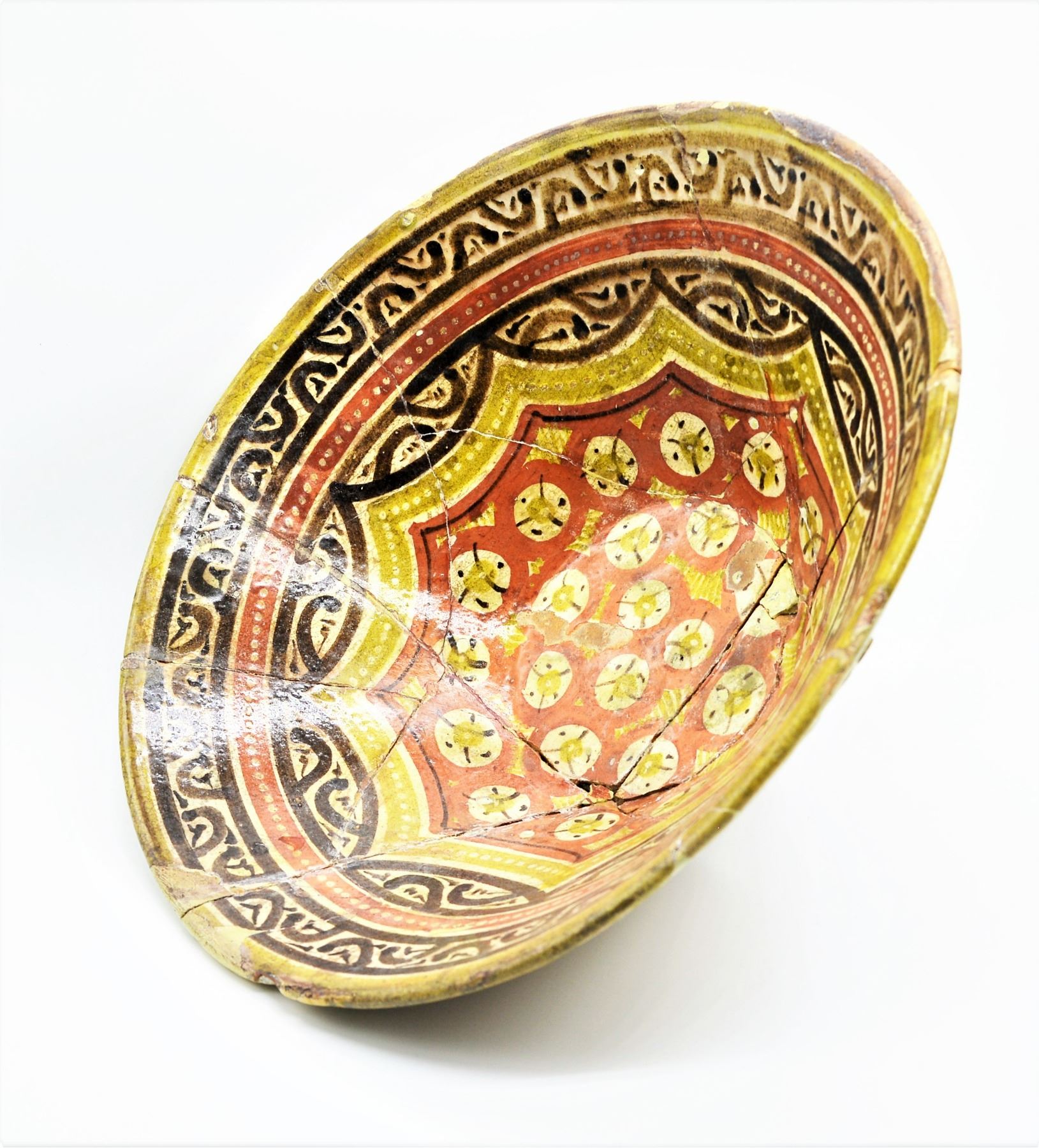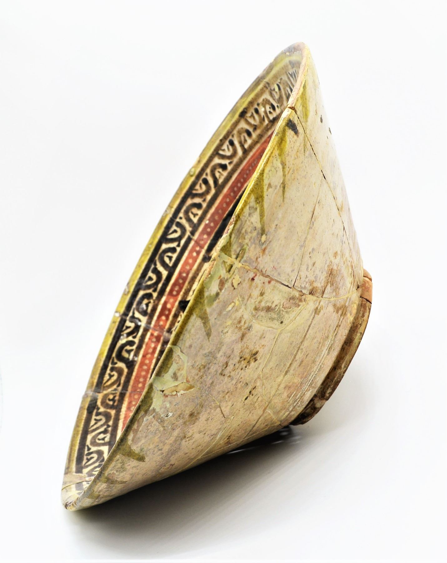 A LARGE ANCIENT ISLAMIC NISHAPUR OR SAMARKAND MULTI COLOR DECORATED SLIP PAINTED POTTERY BOWL 10TH CENTURY, NISHAPUR OR SAMARQAND SAMANID PERIOD. Of Large Size & Very Decorated with Impressive Designs in multi colors, Black, Yellow, Red & Lustre. Beautiful Flowers, Motifs, Arabseque & Large Geometric shape & design in the center of the bowl. of truncated conical form with straight flaring sides on a low foot, decorated in coloured slips with a cruciform design chain-pattern borders,The technique of overglaze lustre firing was a closely-guarded secret in the 10th century and the potters of Nishapur had to be content with replicating the effect of true lustre using underglaze earthy pigments. As with the majority of Nishapur figural designs, the identity of the subject matter remains elusive.