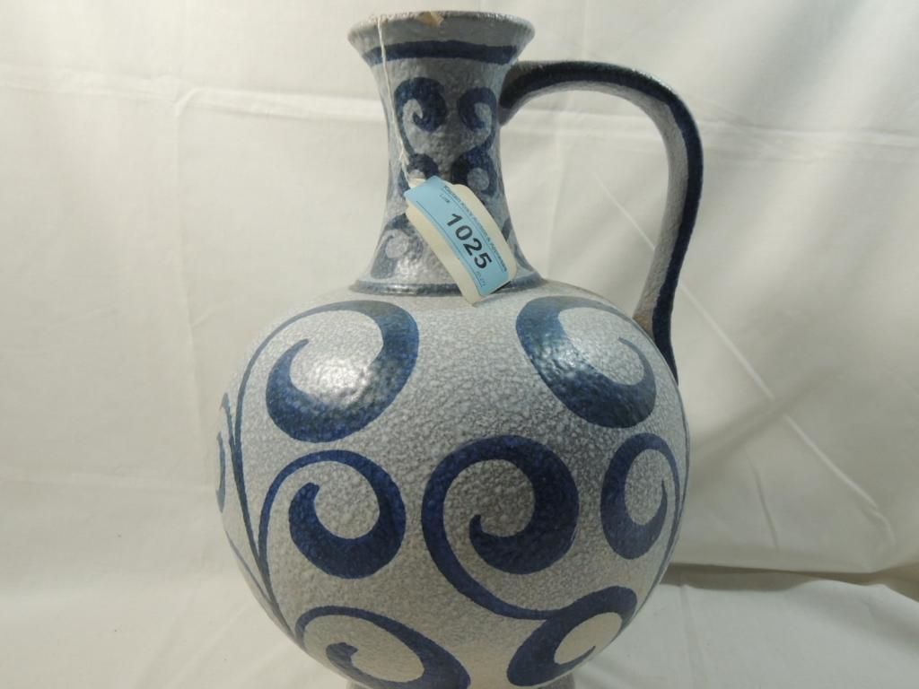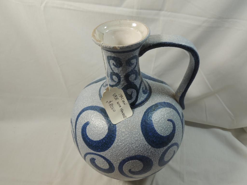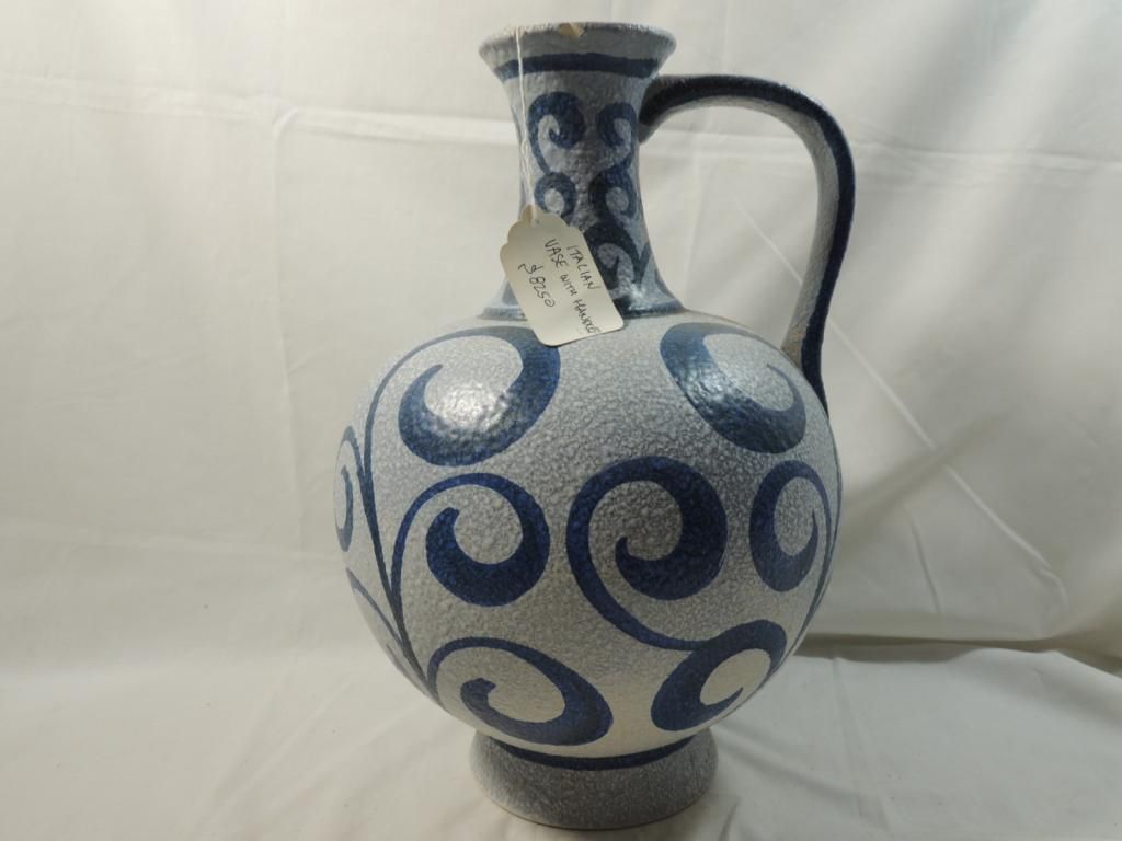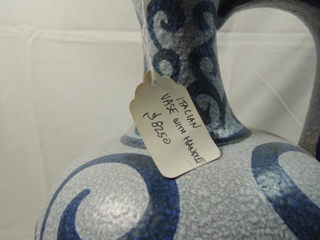LARGE ITALIAN VASE WITH HANDLE BLUE SWIRL DESIGN. AS SHOWN. SEE PHOTO FOR MORE DETAILS.