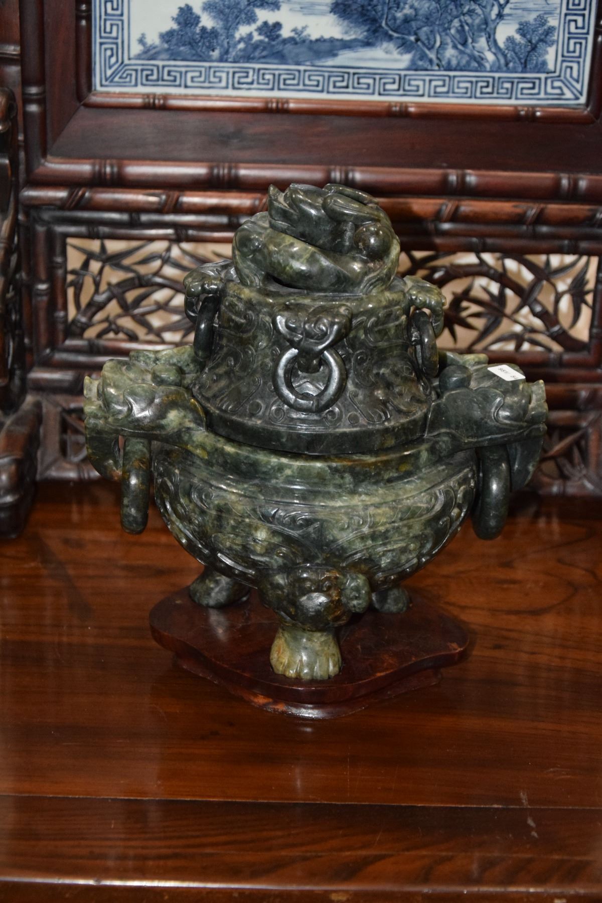 LARGE JADE CENSER WITH FU DOG MOTIF & CUSTOM STAND