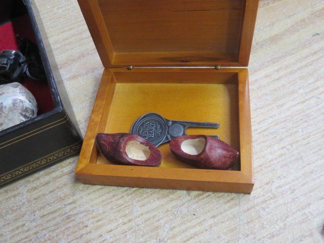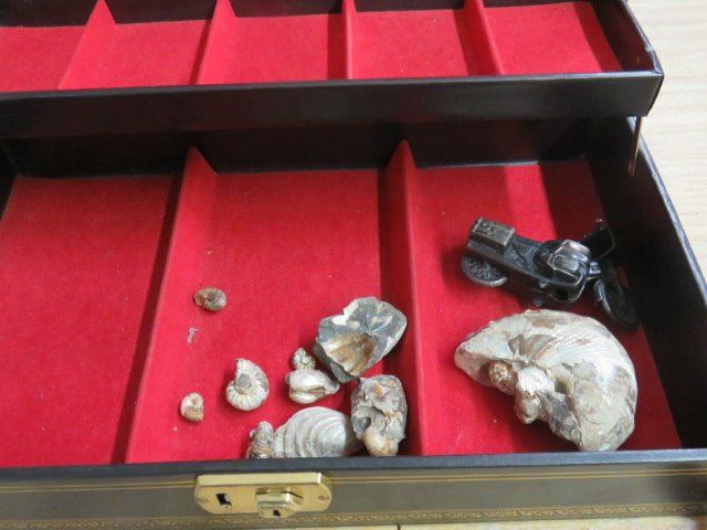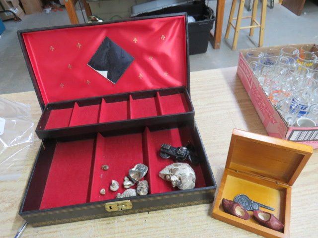 LARGE JEWELLERY BOX W/SHELLS, (PENCIL SHARPENER, GOLF TEE, ETC)