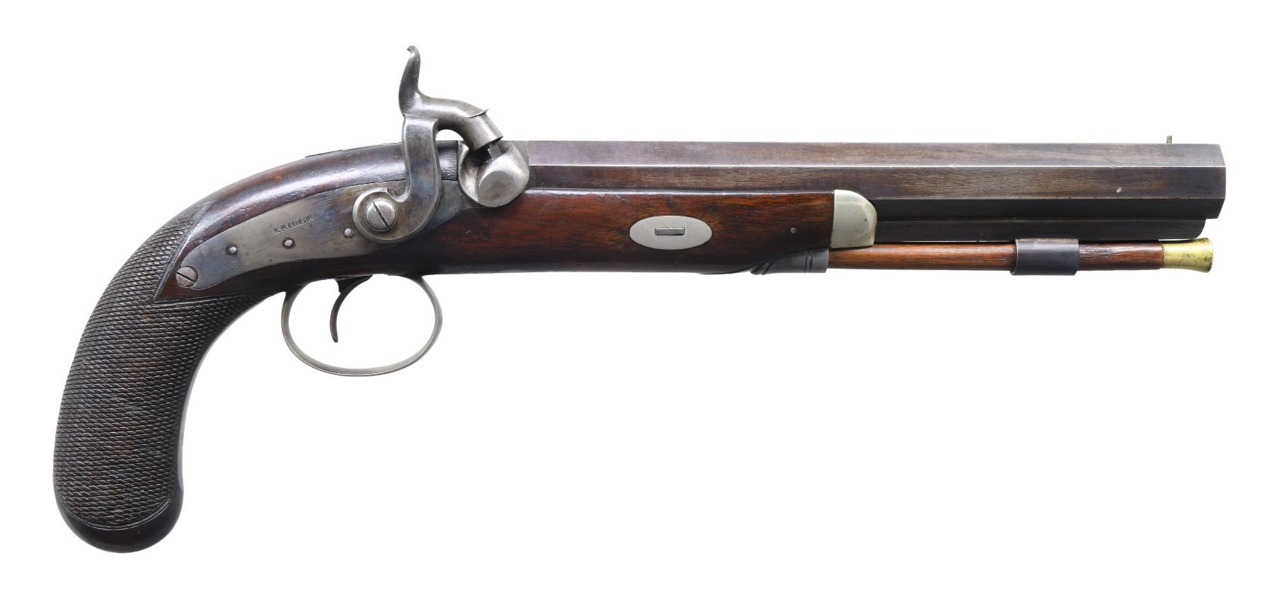 PISTOL. Cal. .50. S# NSN. (See above double rifle description for info on John Krider.) The browned 9" octagon barrel with under rib is marked "KRIDER PHILAD.a" on top flat. Case hardened breech plug integral with top tang is fitted with rear sight and does not have blow out. Back spring lock with flat faced hammer is marked "KRIDER". Trigger plate has stylized pineapple finial. American walnut stock with checkered bag grip and German silver tip attaches to barrel with captive sidebolt through oval German silver escutcheons. Hickory ramrod with brass tip and tail (worm under cap) mounts through single plain pipe and nicely filed thimble. CONDITION: very good to fine. Barrel retaining most of its original finish which shows some false twist pattern. A considerable amount of case hardening color remains on iron parts. Stock retains most of its original finish with a lot of marks and dings. Bore is very fine. Mechanically fine. (01-26488/MGM). ANTIQUE. $1,500-2,000.
