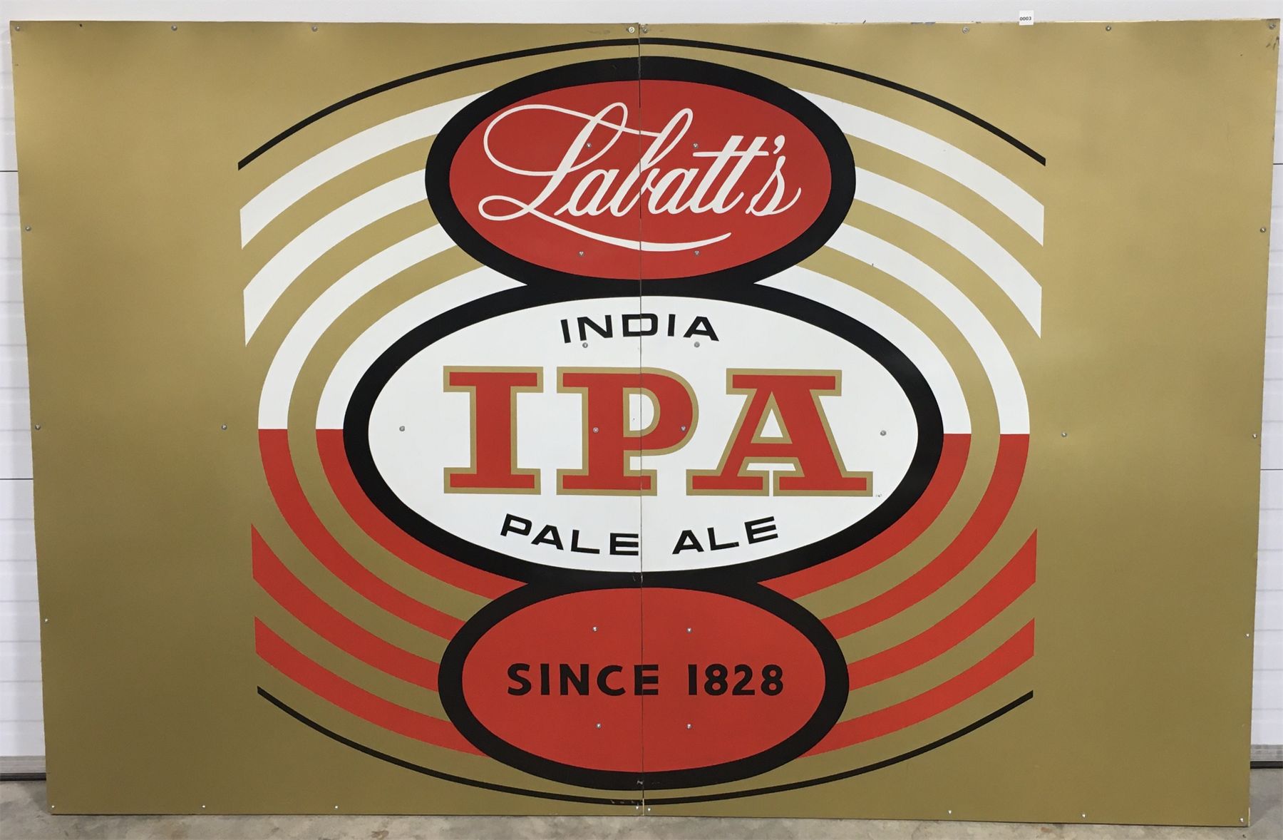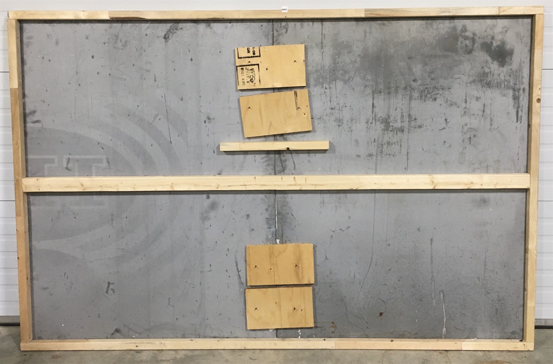 NOTE: APPROX 60 x 91in. SINGLE SIDED METAL SIGN. 2 PANELS MOUNTED ON WOOD FRAME. FRAME CAN BE DISASSEMBLED FOR TRANSPORT.