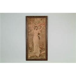 Lot # 561 LARGE LITHO ROLL DOWN ADVERTISEMENT FOR THE UNION PACIFIC TEA CO. A beautiful maid in a sheer gown titled "Hope". Doves above her head and rabbits at her feet. Copyright 1898. SIZE: Incl. frame 21-1/2" w x 44-1/2" h. CONDITION: Very good to excellent. A few small stains on the very top left and right edge, almost completely undetectable as the colors are identical to designs within the sign. 1-29629 (500-700)