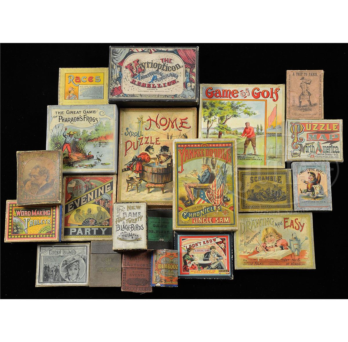 PLEASE NOTE (11/19/13): Photo is wrong, does not include Myriopticon, Pharoah's Frogs, Game of Golf and Cat Puzzle. Lot includes "A Trip to Paris" boxed card game, Two versions of "What D'ye Buy?" showing Punch, of Punch and Judy fame, "The New Game of Blackbirds" 1891, Milton Bradley's "Characters From Dickens" boxed card game, Boxed game of "Scramble", Puzzle map of North America by Milton Bradley, Milton Bradley's "Races", Milton Bradley's "I Don't Know", Milton Bradley's "Excursion to Coney Island", Three different sets of "Drawing Made Easy" by McLoughlin Bros., "Dr. Fuzby" card game by Ives, Two "Game of Authors" card games by Porter & Coates, Two versions of "The Evening Party" by Milton Bradley, Word making tablets by Milton Bradley, "Celestial Kingdom" puzzle by Milton Bradley, and the game of "Bamboozle". SIZE: Largest 7" l. PROVENANCE: The Diane and late Steve Olin collection. CONDITION: Good to very good. 13271-21