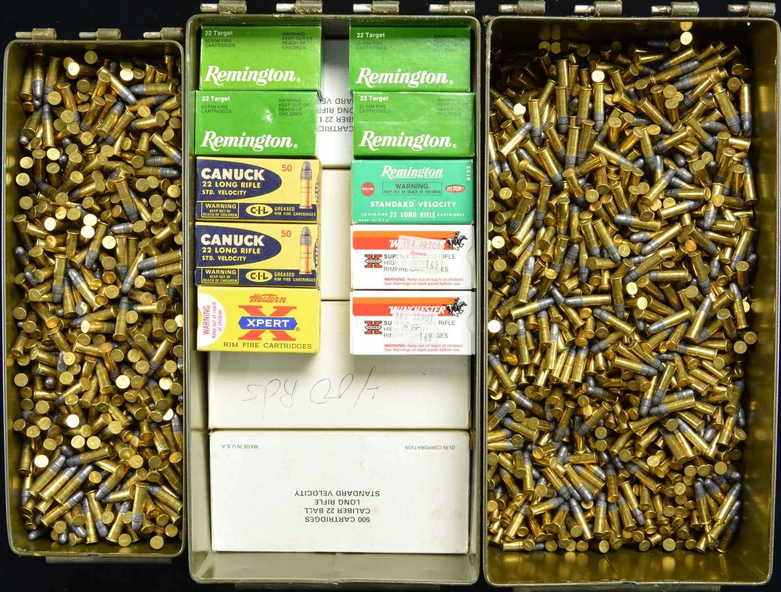 500 RDS. (10 BOXES) by Remington, WInchester & Canuck. CONDITION: boxes in good to very good overall condition w/ some torn end flaps. Ammo appears serviceable. (02-18989-4/MD). $300-400.