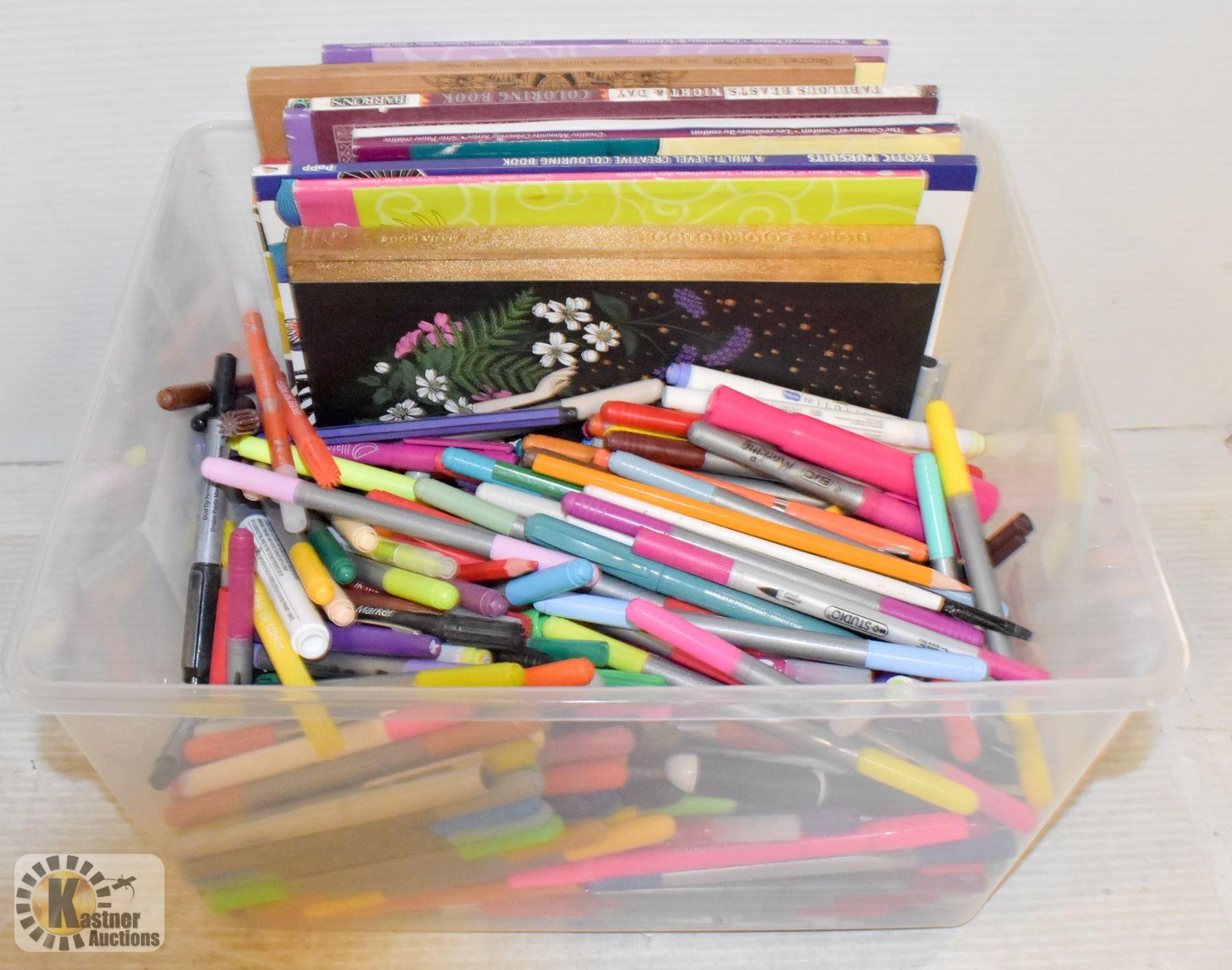 LARGE LOT OF ADULT COLOURING BOOKS PLUS MARKERS
