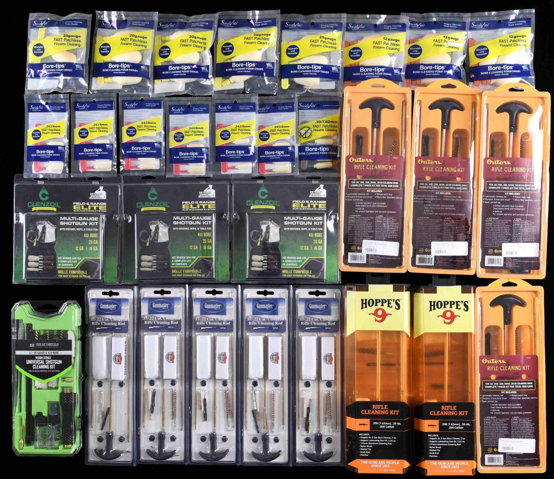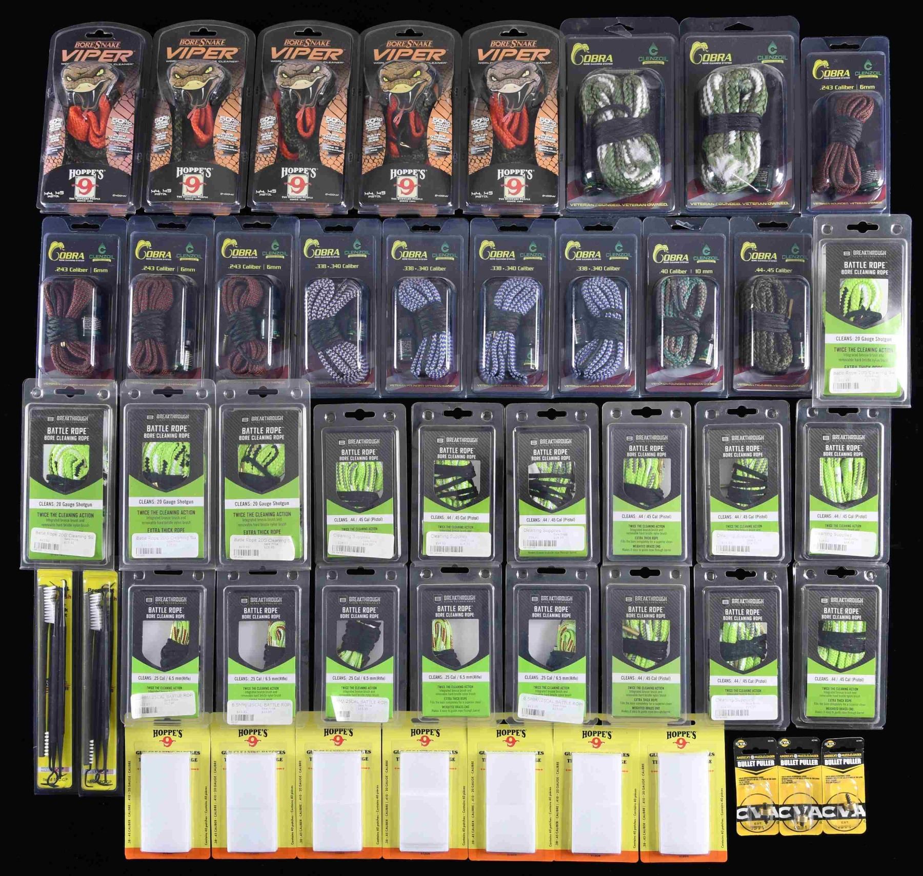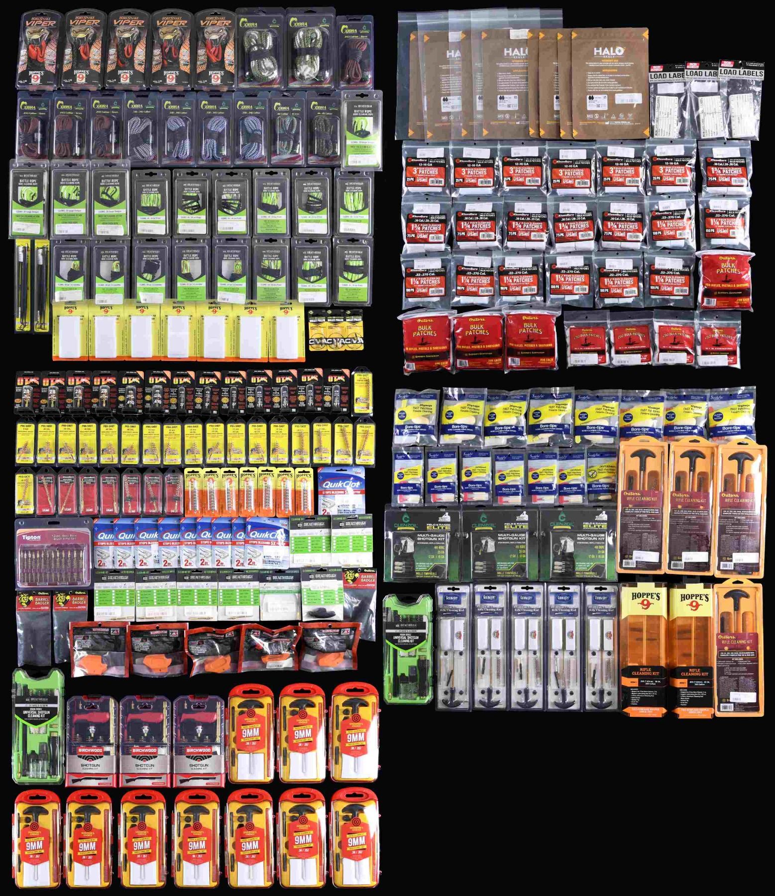Large lot of assorted firearms cleaning supplies, including: 1) 6 assorted 20 GA bore ropes. 2) 18 assorted .44 / .45 Caliber bore ropes. 3) 4 assorted .243 / 6mm bore ropes. 4) 3 assorted .25 / 6.5mm bore ropes. 5) 4 assorted .338-.340 Caliber bore ropes. 6) 8 assorted multi-gauge shotgun cleaning kits. 7) 10 assorted 9mm .38 / .357 Caliber cleaning kits. 8) 5 .17 / .22 Caliber cleaning kits. 9) 6 assorted .30 Caliber cleaning kits. 10) assortment of bore patches, brush tips, and a few other accessories. CONDITION: virtually new, with items remaining in their original factory packaging. (02-23808/MLW). $200-300.
