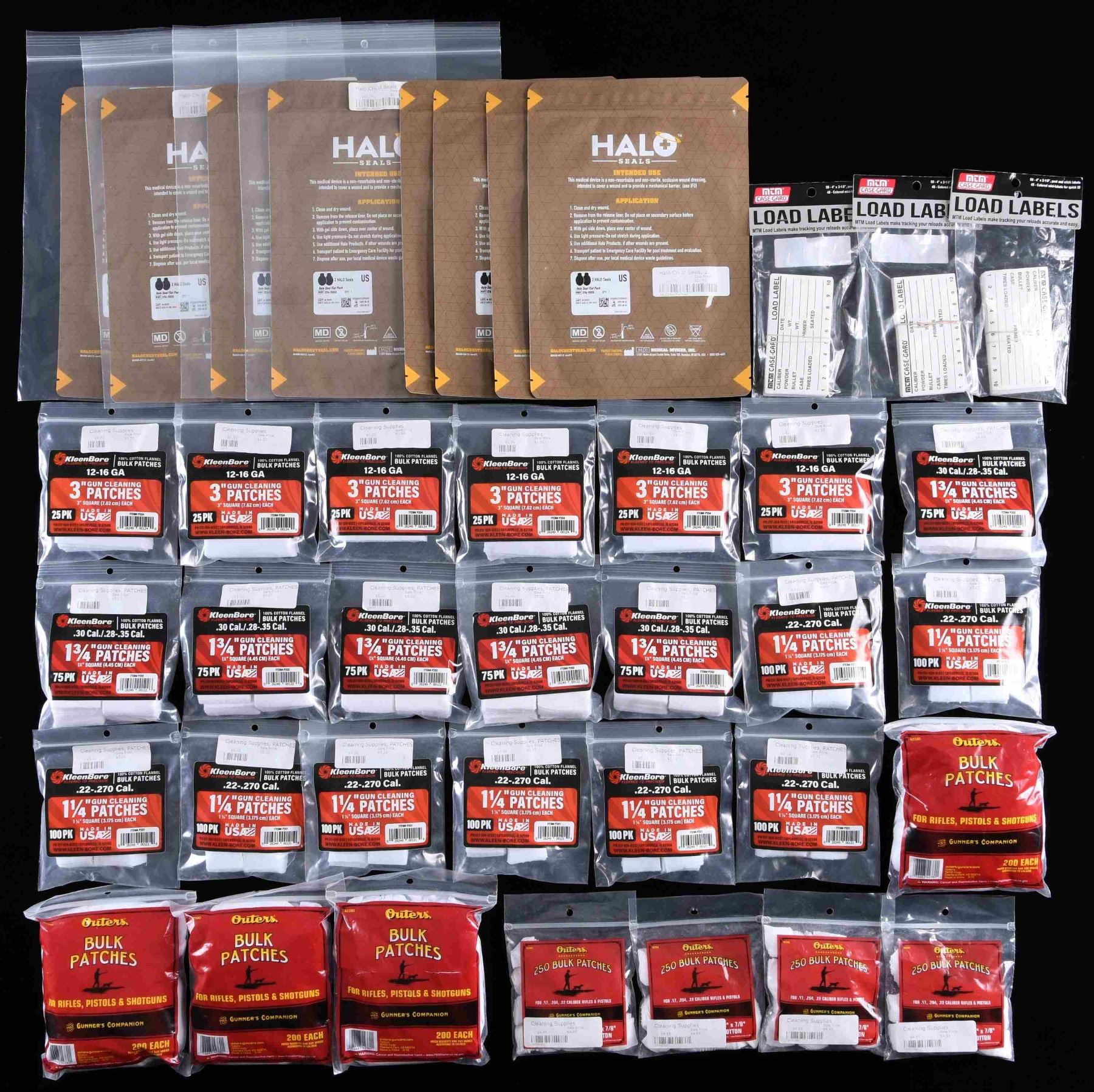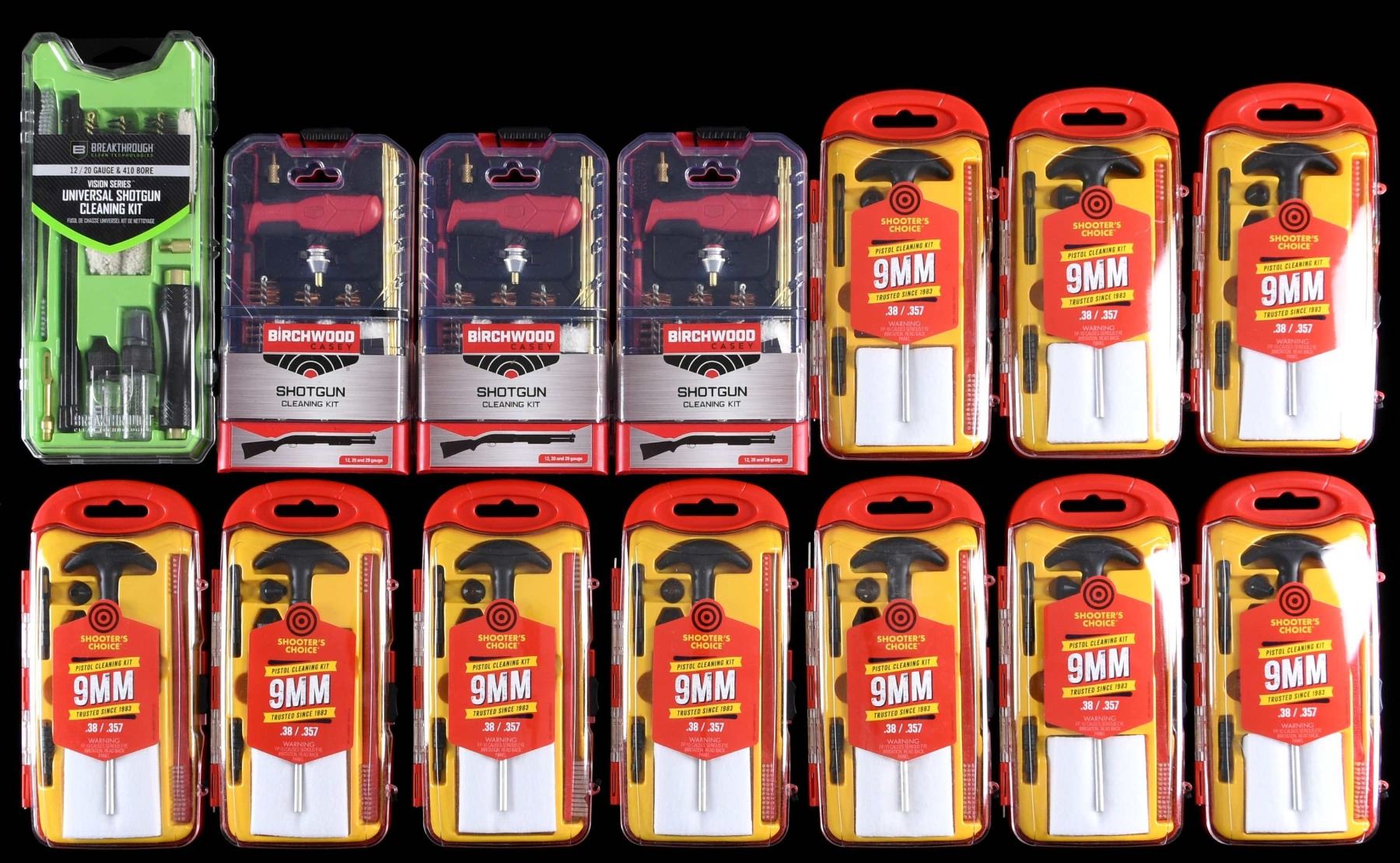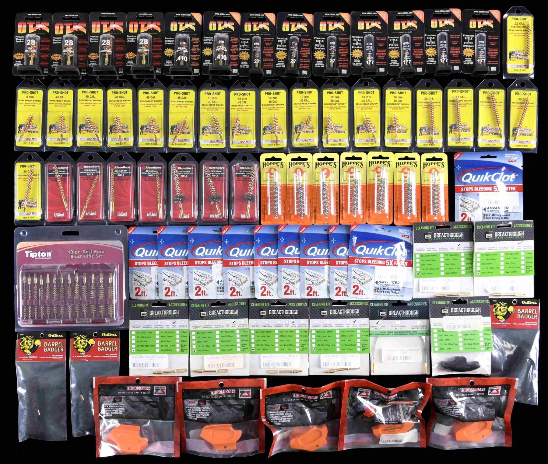 Large lot of assorted firearms cleaning supplies, including: 1) 6 assorted 20 GA bore ropes. 2) 18 assorted .44 / .45 Caliber bore ropes. 3) 4 assorted .243 / 6mm bore ropes. 4) 3 assorted .25 / 6.5mm bore ropes. 5) 4 assorted .338-.340 Caliber bore ropes. 6) 8 assorted multi-gauge shotgun cleaning kits. 7) 10 assorted 9mm .38 / .357 Caliber cleaning kits. 8) 5 .17 / .22 Caliber cleaning kits. 9) 6 assorted .30 Caliber cleaning kits. 10) assortment of bore patches, brush tips, and a few other accessories. CONDITION: virtually new, with items remaining in their original factory packaging. (02-23808/MLW). $200-300.