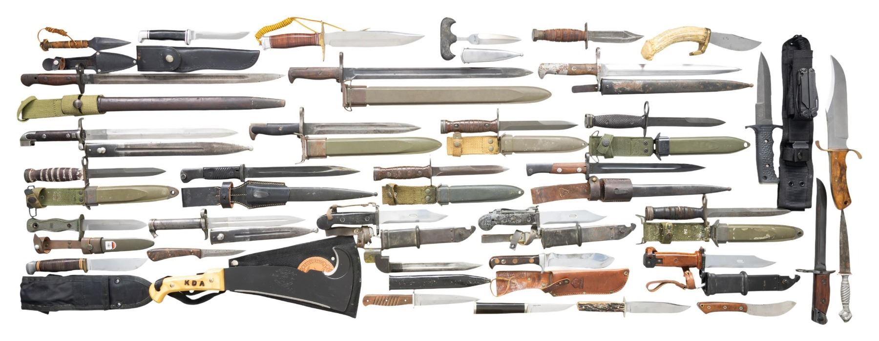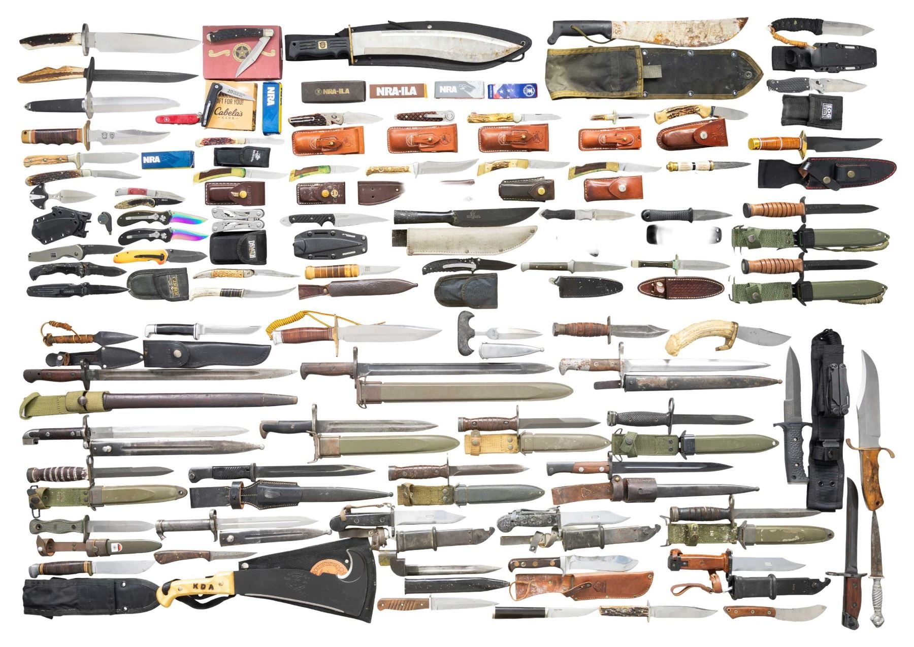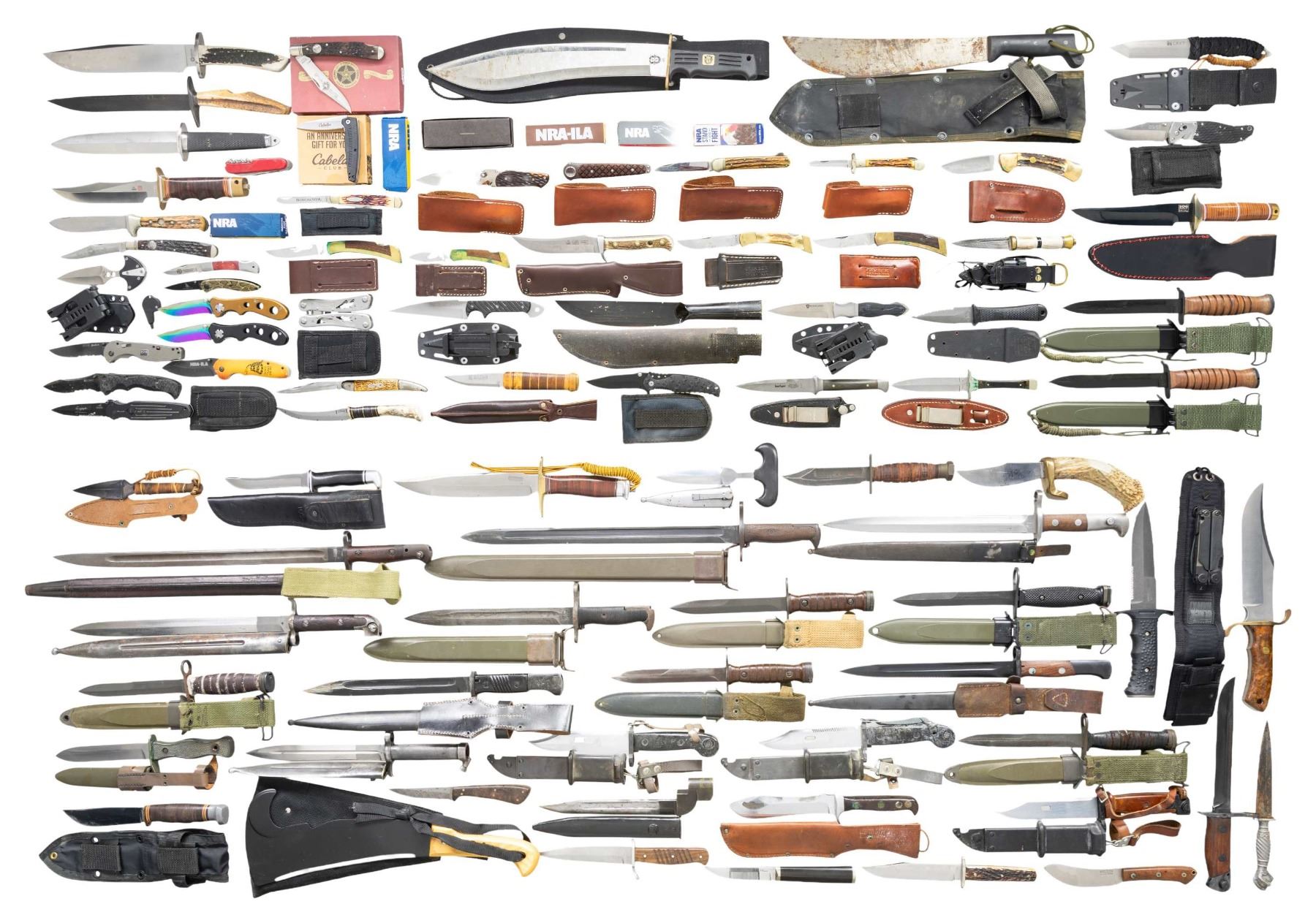 Large lot of assorted knives and edged weapons, including: 1) Boker Arbolito El Gigante fixed blade knife. 2-piece pinned horn grip scales. 2) Behring custom fixed blade fillet knife. Blued steel finish with 1-piece pinned bone or horn handle. 3) Puma Skinner fixed blade knife. 2-piece horn grip scales. Complete with brown leather sheath. 4) Northwoods 2004 custom Scagel trailing point fixed blade knife. Leather washer, brass spacer, and 1-piece pinned horn handle. 5) Puma JAGD Nicker fixed blade knife. 2-piece horn grip scales. 6) Brusletto fixed blade knife. Dark and light wood handle. Complete with Norwegian tooled brown leather sheath. 7) Case XX Model P62 spear point fixed blade boot knife. 2-piece pinned wood grip scales. Complete with brown leather sheath. 8) Black Label Model 102BL spear point fixed blade boot knife. Complete with black synthetic sheath. 9) Axen custom fixed blade damascus knife. Brass circular bolster and pommel with horn handle. Complete with brown leather sheath. 10) Seki / AL MAR Randall style clip point fixed blade fighting knife. Brass guard and pommel with alloy spacers. Finger groove brown leather washer handle with black, red, and white synthetic spacers. 11) Tai Pan VG-1 spear point fixed blade knife. 1-piece checkered and grooved black rubber handle. 12) CRKT First Strike tanto fixed black knife. Black textured and cloth wrapped handle. Complete with black synthetic and nylon sheath. 13) SOG Specialty Knives false edge fixed blade knife. Brass guard and pommel with leather disc and white synthetic spacer handle. Complete with black leather sheath. 14) Kershaw No. 4351 spear point fixed blade military boot knife. 2-piece pinned micarta grip scales. Complete with black leather holster. 15) SOG Specialty Knives spear point fixed blade knife. Rear edge of blade is serrated. 1-piece checkered and grooved black rubber handle. Complete with black synthetic sheath. 16) CRKT C/K Dragon wharncliffe fixed blade knife. 2-piece grooved black G10 grip scales. Complete with black synthetic sheath. 17) Black Label Volatile Model 108BL fixed blade push dagger. 2-piece G10 grip scales. Complete with black leather sheath. 18) Boker M3 fixed blade trench knife. Grooved brown leather disc handle. Complete with steel and OD nylon scabbard. 19) Boker M3 fixed blade trench knife. Grooved brown leather disc. handle. Complete with steel and OD nylon scabbard. 20) SOG Aritech VG10 folding knife. 2-piece faux horn grip scales. Complete with brown leather A.G. Russel Knives pouch. 21) Puma Best No. 563 folding knife. 2-piece pinned horn grip scales. Complete with brown leather A.G. Russel Knives pouch. 22) Lone Wolf Knives Defender folding knife. 2-piece textured wood grip panels. Complete with brown leather A.G. Russel Knives pouch. 23) Hubertus Model 2567 folding knife. Pinned 2-piece horn grip scales. Complete with brown leather A.G. Russel Knives pouch. 24) Boker Tree Brand Classic 4000 folding knife. Pinned 2-piece horn grip scales. Complete with brown leather pouch. 25) Gerber folding knife. Brass body with 2-piece wood grip scales. 26) Colonial Fish-Knife folding knife. 2-piece faux horn grip scales. 27) Gerber Rex Applegate folding knife. 2-piece textured black G10 grip scales. 28) CRKT My Tighe folding knife. Steel body with 2-piece textured black synthetic grip scales. 29) SOG Tomcat 3.0 folding knife. 2-piece checkered black rubber grip scales. Complete with black nylon pouch. 30) SOG Flash II folding knife. 2-piece gray textured alloy frame. 31) Duluth Trading Co. folding knife. 2-piece black alloy frame. 32) Duluth Trading Co. folding knife. 2-piece bronze anodized alloy frame. 33) Gerber folding knife. Brass frame with 2-piece plain wood grip scales. Complete with brown leather pouch. 34) Gerber folding knife. Brass frame with 2-piece plain wood grip scales. Complete with brown leather pouch. 35) Chinese mfg. folding knife. Steel frame with 2-piece black rubber grip scales. Complete with black nylon pouch. 36) Gerber folding knife. Brass frame with 2-piece plain horn grip scales. Complete with brown leather pouch. 37) Winchester 2-blade folding knife. 2-piece faux horn grip scales. Complete with black nylon pouch. 38) Swiss Army knife. 2-piece red synthetic grip scales. 39) Duluth Leatherman style multi-tool. Complete with black nylon pouch. 40) Western Texas Rangers 175th anniversary folding knife. 2-piece horn grip scales. 41) Western Rangers 175th anniversary folding knife. 2-piece horn grip scales. Complete with commemorative cardboard box. 42) x9 assorted NRA folding knives. 3 without boxes. 43) Cabela's Club 20th anniversary folding knife. 2-piece black synthetic grip scales. Complete with cardboard box. 44) Bushman survival knife. 1-piece steel construction. Hollow handle. Complete with black nylon scabbard. 45) Corneta No. 127 machete. 1-piece black synthetic handle. Complete with nylon scabbard. 46) Taylor Surgical MACV SOG machete. 1-piece textured black synthetic handle. Complete with black nylon scabbard. CONDITION: knives, sheaths, and scabbards show varying degrees of wear ranging from very good to fair. Some knives show scattered scratches, sharpening marks, and spots of oxidation. (02-25183/MLW). NON-GUN. $1,000-2,000.
