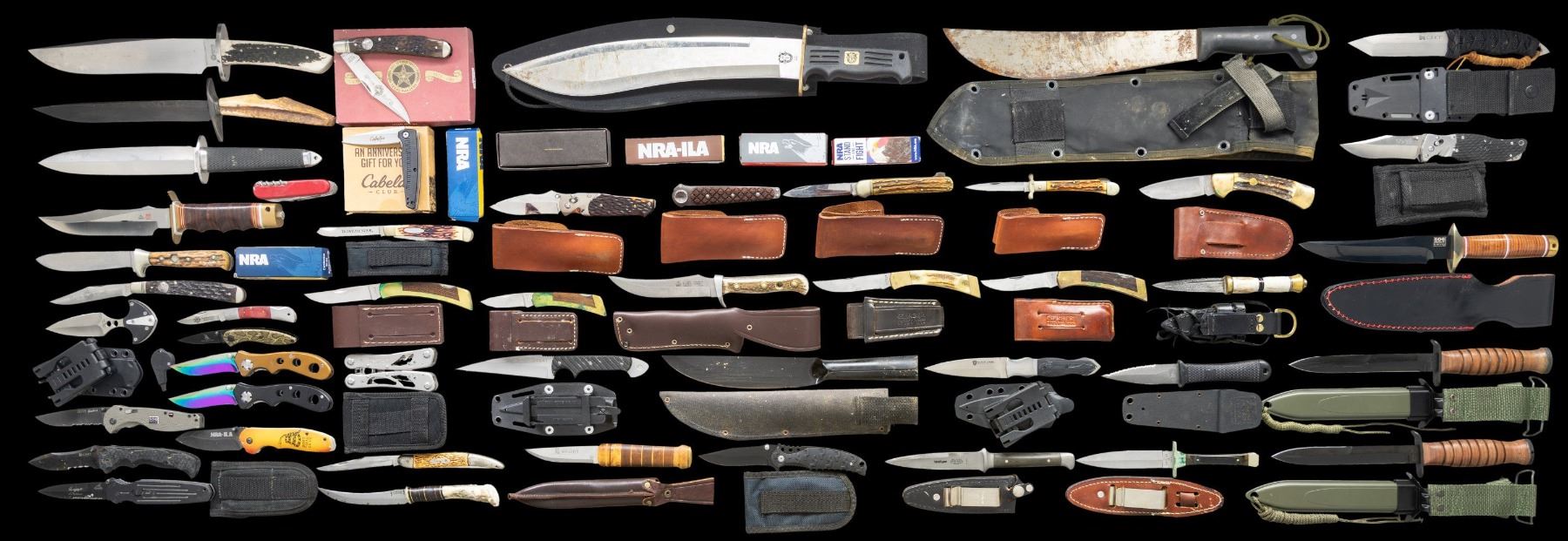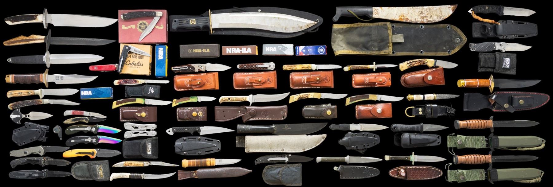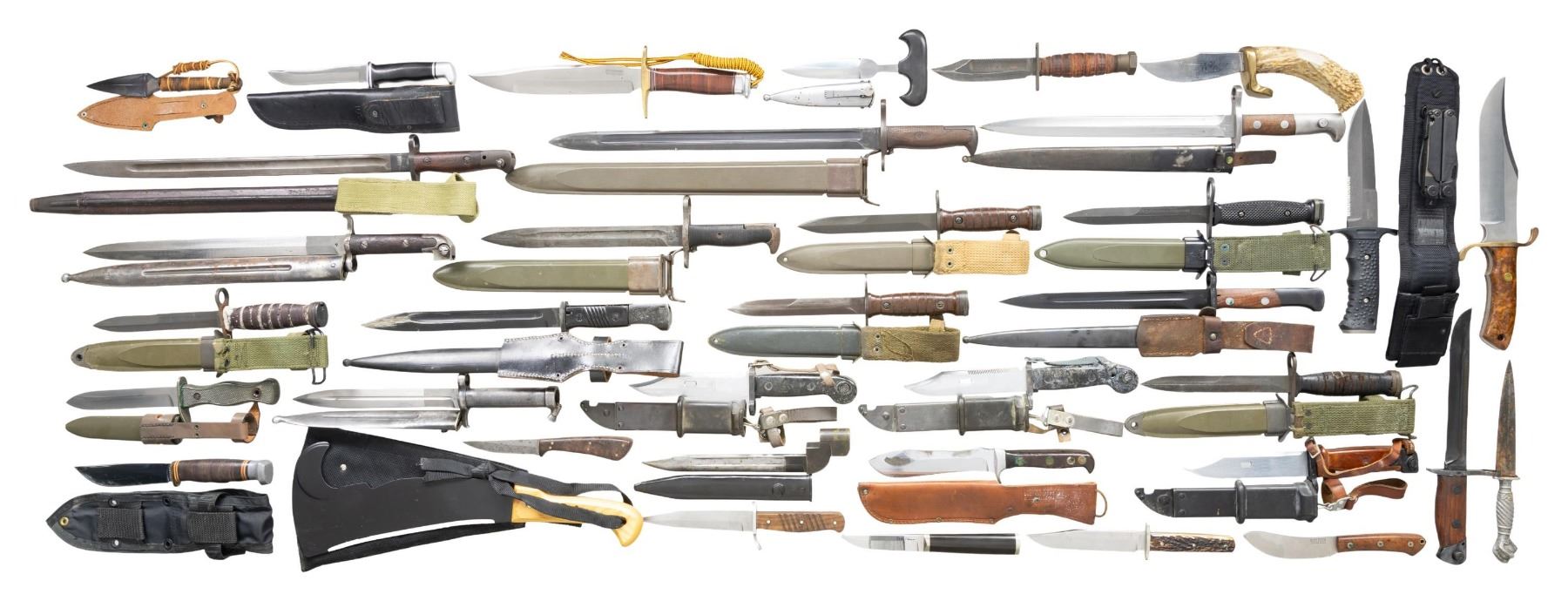 Large lot of assorted knives and edged weapons, including: 1) Boker Arbolito El Gigante fixed blade knife. 2-piece pinned horn grip scales. 2) Behring custom fixed blade fillet knife. Blued steel finish with 1-piece pinned bone or horn handle. 3) Puma Skinner fixed blade knife. 2-piece horn grip scales. Complete with brown leather sheath. 4) Northwoods 2004 custom Scagel trailing point fixed blade knife. Leather washer, brass spacer, and 1-piece pinned horn handle. 5) Puma JAGD Nicker fixed blade knife. 2-piece horn grip scales. 6) Brusletto fixed blade knife. Dark and light wood handle. Complete with Norwegian tooled brown leather sheath. 7) Case XX Model P62 spear point fixed blade boot knife. 2-piece pinned wood grip scales. Complete with brown leather sheath. 8) Black Label Model 102BL spear point fixed blade boot knife. Complete with black synthetic sheath. 9) Axen custom fixed blade damascus knife. Brass circular bolster and pommel with horn handle. Complete with brown leather sheath. 10) Seki / AL MAR Randall style clip point fixed blade fighting knife. Brass guard and pommel with alloy spacers. Finger groove brown leather washer handle with black, red, and white synthetic spacers. 11) Tai Pan VG-1 spear point fixed blade knife. 1-piece checkered and grooved black rubber handle. 12) CRKT First Strike tanto fixed black knife. Black textured and cloth wrapped handle. Complete with black synthetic and nylon sheath. 13) SOG Specialty Knives false edge fixed blade knife. Brass guard and pommel with leather disc and white synthetic spacer handle. Complete with black leather sheath. 14) Kershaw No. 4351 spear point fixed blade military boot knife. 2-piece pinned micarta grip scales. Complete with black leather holster. 15) SOG Specialty Knives spear point fixed blade knife. Rear edge of blade is serrated. 1-piece checkered and grooved black rubber handle. Complete with black synthetic sheath. 16) CRKT C/K Dragon wharncliffe fixed blade knife. 2-piece grooved black G10 grip scales. Complete with black synthetic sheath. 17) Black Label Volatile Model 108BL fixed blade push dagger. 2-piece G10 grip scales. Complete with black leather sheath. 18) Boker M3 fixed blade trench knife. Grooved brown leather disc handle. Complete with steel and OD nylon scabbard. 19) Boker M3 fixed blade trench knife. Grooved brown leather disc. handle. Complete with steel and OD nylon scabbard. 20) SOG Aritech VG10 folding knife. 2-piece faux horn grip scales. Complete with brown leather A.G. Russel Knives pouch. 21) Puma Best No. 563 folding knife. 2-piece pinned horn grip scales. Complete with brown leather A.G. Russel Knives pouch. 22) Lone Wolf Knives Defender folding knife. 2-piece textured wood grip panels. Complete with brown leather A.G. Russel Knives pouch. 23) Hubertus Model 2567 folding knife. Pinned 2-piece horn grip scales. Complete with brown leather A.G. Russel Knives pouch. 24) Boker Tree Brand Classic 4000 folding knife. Pinned 2-piece horn grip scales. Complete with brown leather pouch. 25) Gerber folding knife. Brass body with 2-piece wood grip scales. 26) Colonial Fish-Knife folding knife. 2-piece faux horn grip scales. 27) Gerber Rex Applegate folding knife. 2-piece textured black G10 grip scales. 28) CRKT My Tighe folding knife. Steel body with 2-piece textured black synthetic grip scales. 29) SOG Tomcat 3.0 folding knife. 2-piece checkered black rubber grip scales. Complete with black nylon pouch. 30) SOG Flash II folding knife. 2-piece gray textured alloy frame. 31) Duluth Trading Co. folding knife. 2-piece black alloy frame. 32) Duluth Trading Co. folding knife. 2-piece bronze anodized alloy frame. 33) Gerber folding knife. Brass frame with 2-piece plain wood grip scales. Complete with brown leather pouch. 34) Gerber folding knife. Brass frame with 2-piece plain wood grip scales. Complete with brown leather pouch. 35) Chinese mfg. folding knife. Steel frame with 2-piece black rubber grip scales. Complete with black nylon pouch. 36) Gerber folding knife. Brass frame with 2-piece plain horn grip scales. Complete with brown leather pouch. 37) Winchester 2-blade folding knife. 2-piece faux horn grip scales. Complete with black nylon pouch. 38) Swiss Army knife. 2-piece red synthetic grip scales. 39) Duluth Leatherman style multi-tool. Complete with black nylon pouch. 40) Western Texas Rangers 175th anniversary folding knife. 2-piece horn grip scales. 41) Western Rangers 175th anniversary folding knife. 2-piece horn grip scales. Complete with commemorative cardboard box. 42) x9 assorted NRA folding knives. 3 without boxes. 43) Cabela's Club 20th anniversary folding knife. 2-piece black synthetic grip scales. Complete with cardboard box. 44) Bushman survival knife. 1-piece steel construction. Hollow handle. Complete with black nylon scabbard. 45) Corneta No. 127 machete. 1-piece black synthetic handle. Complete with nylon scabbard. 46) Taylor Surgical MACV SOG machete. 1-piece textured black synthetic handle. Complete with black nylon scabbard. CONDITION: knives, sheaths, and scabbards show varying degrees of wear ranging from very good to fair. Some knives show scattered scratches, sharpening marks, and spots of oxidation. (02-25183/MLW). NON-GUN. $1,000-2,000.