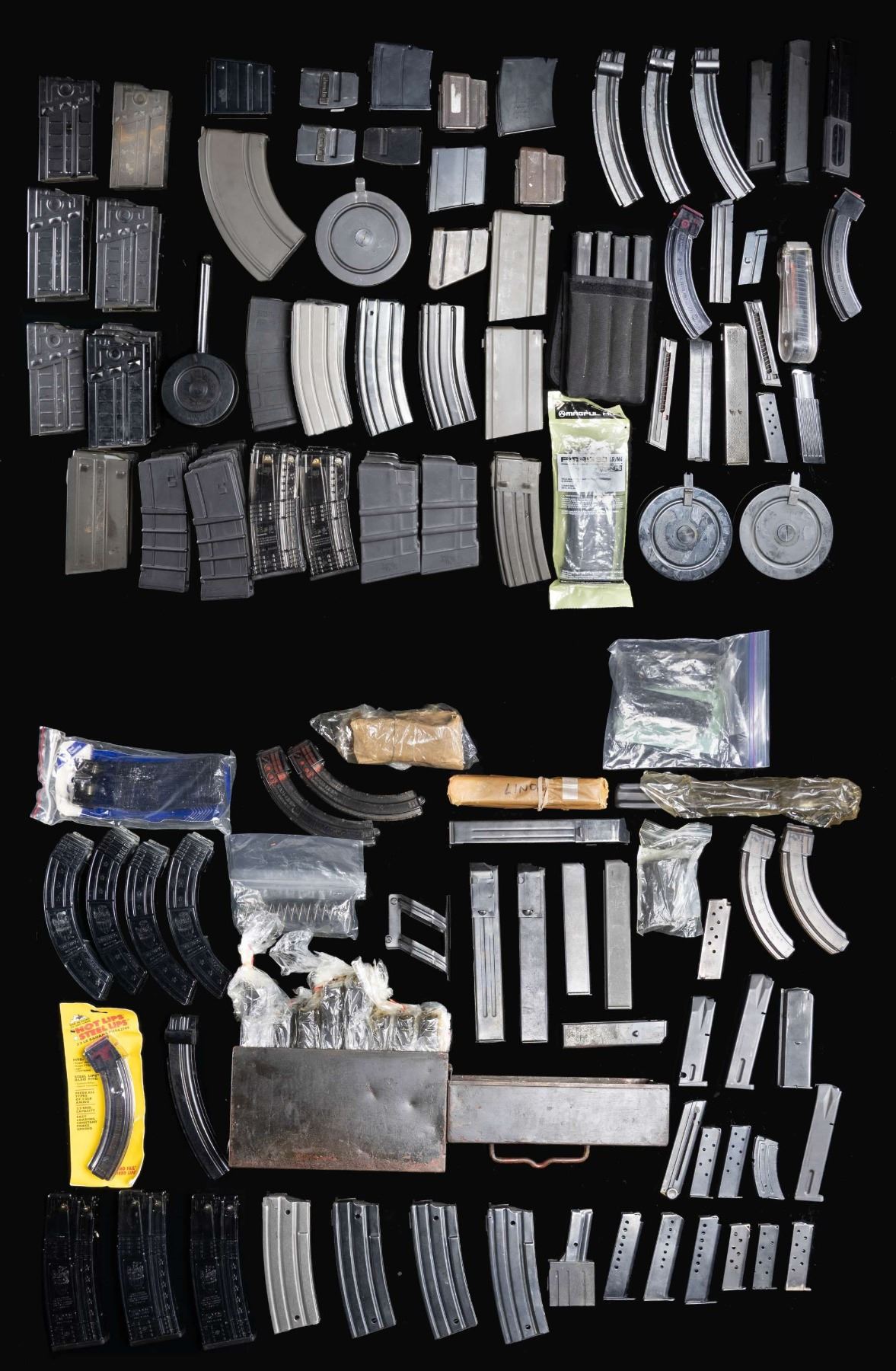Large lot of assorted mags., including: 1) x3 Swiss Schmidt Rubin 7.5x55mm Swiss 6-rd. mags. 2) x2 Czech vz. 52 7.62x39mm 10-rd. mags. 3) x1 British SMLE .303 British 10-rd. mag. 4) x1 reproduction British SMLE 7.62x51mm NATO 10-rd. mag. 5) x1 reproduction Russian SVT-40 7.62x54R 10-rd. mag. 6) x1 reproduction Egyptian Hakim 8mm Mauser 10-rd. mag. 7) x1 reproduction German G43/K43 8mm Mauser 10-rd. mag. 8) x8 German MG-13 8mm Mauser 25-rd. mags. in original steel transit chest. 9) x11 assorted G3/HK91 pattern 7.62x51mm NATO 20-rd. mags. 10) x1 British Bren Mk. II .303 British 30-rd. mag. 11) x3 Swiss SIG AMT 7.62x51mm NATO 20-rd. mags. 12) x1 Italian Beretta BM59 7.62x51mm NATO 20-rd. mag. 13) x2 Italian Beretta AR-70/90 5.56x45mm NATO 30-rd. mags. 14) x6 assorted aluminum AR-15 5.56x45mm NATO 30-rd. mags. 15) x7 Thermold black polymer AR-15 5.56x45mm NATO 30-rd. mags. 2 marked with the Canadian maple leaf on the left side of the body. 16) x2 MAGPUL PMAG black polymer AR-15 5.56x45mm NATO 30-rd. mags.17) x7 Eagle "smoke" transparent plastic 5.56x45mm NATO 30-rd. mags. 18) x5 Thermold black polymer 7.62x51mm NATO 20-rd. mags. 19) x4 unmarked steel NATO Ruger Mini-14 or Mini-30 mags. 20) x4 Eagle "smoke" transparent plastic 5.56x45mm NATO 30-rd. mags. 21) x4 Ram-Line "smoke" transparent plastic .22 LR Ruger 10/22 30-rd. mags. 22) x4 Eagle black plastic .22 LR Ruger 10/22 30-rd. mags. 23) x3 Butler Creek plastic .22 LR Ruger 10/22 25-rd. mags. 24) x1 MWG transparent plastic .22 LR Ruger 10/22 50-rd. mag. 25) x4 Cobray M-11 black polymer 9x19mm Parabellum 32-rd. mags. in Cobray black nylon 4-cell pouch. 26) x2 Wilkinson Arms Linda 9x19mm Parabellum 31-rd. mags. 27) x1 Steyr ("98E" code) MP-40 9x19mm Parabellum magazine. 28) x1 reproduction MP-40 9x19mm Parabellum 32-rd. mag. 29) x1 British Sten 9x19mm Parabellum 32-rd. mag. 30) x1 Colt SMG 9x19mm Parabellum 32-rd. mag. 31) Italian Beretta MAB 38 9x19mm Parabellum 20-rd. mag. 32) x1 Uzi 9x19mm Parabellum 32-rd. mag. with unidentified adaptation. 33) x2 Grendel R-31 black polymer .22 WMR 30-rd. mags. 34) x1 Bingham Taylor Mk. I .45 ACP 28-rd. drum mag. 35) x1 Glock black polymer 9x19mm Parabellum 31-rd. mag. 36) x1 Beretta M9 9x19mm Parabellum 15-rd. mag. 37) x3 Beretta M9 9x19mm Parabellum 20-rd. mags. 38) x1 Beretta M9 9x19mm Parabellum 30-rd. mag. 39) x1 Chinese C96 9x19mm Parabellum (approx.) 20-rd. mag. 40) x1 Unmarked P.08 Luger 9x19mm Parabellum 8-rd. mag. 41) x3 P.38 9x19mm Parabellum 8-rd. mags. 1 of WWII production, 2 of aftermarket production. 42) x1 Walther PPK 7.65x17mmSR 8-rd. mag. 43) x1 Astra Model 600 9x23mm Largo 8-rd. mag. 44) x6 assorted European pistol mags. 45) x2 assorted .22 LR pistol mags. 46) x5 assorted .22 LR rifle mags. 47) x4 Bingham PPS/50 .22 LR 30-rd. mags. 48) x2 Bingham PPS/50 .22 LR 50-rd. drum mags. 49) Sites Spectre folding stock and black polymer foregrip. 50) Unidentified steel optic dovetail mount. 51) Unidentified green nylon sling is arsenal packing paper with AK/SKS pattern butt trap cleaning kit. 52) 2 Unidentified mags. CONDITION: mags. show varying degrees of wear and scattered superficial handling marks, but all otherwise appear sturdy and serviceable. (02-24536-12/MLW). NON-GUN. $500-1,000.