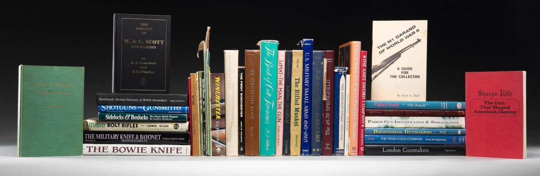 Large lot of assorted reference books, including: 1) "The M1 Garand of World War II" by Scott A. Duff. 2) "The Rifled Musket" by Claud E. Fuller. 3) "LeMat: The Man, The Gun" by Valmore J. Forgett, Alain F. & Marie Antoinette Serpette. 4) "Trapdoor Springfield" by M.D. "Bud" Waite & B.D. Ernst. 5) "The .45-70 Springfield" Trade Edition by Albert J. Frasca & Robert H. Hill. 6) "U.S. Military Firearms" by Major James E. Hicks. 7) "United States Military Small Arms 1816-1865" by Robert M. Reilly. 8) "Naval Swords" by P.G.W. Annis. 9) The American Sword 1775-1945" by Harold L. Peterson.10) "The Ames Sword Company" by John D. Hamilton. 11) "The American Eagle-Pommel Sword: The Early Years - 1794-1830" by E. Andrew Mobray. 12) "The Book of Colt Firearms" by R.L. Wilson. 13) Signed first edition "The Winchester Book" by George Madis. 14) "Winchester: The Gun That Won the West" by Harold F. Williamson. 15) The First Winchester: The Story of the 1866 Repeated Rifle" by John E. Parsons. 16) Winchester: An American Legend" by R.L. Wilson. 17) "Sharps Rifle: The Gun That Shaped American Destiny" by Martin Rywell. 18) "Uncle Dan Lefever: Master Gunsmith" by Robert W. Elliott. 19) "Parker Guns: The Old Reliable" by Ed Muderlak. 20) "Parker Gun: Identification & Serialization" by Charles E. Price & S.P. Fjestad. 21) "The Ithaca Gun Company: From the Beginning" by Walter Claude Snyder. 22) "Sidelocks & Boxlocks: The Classic British Shotguns" by Geoffrey Boothroyd. 23) "Shotguns and Gunsmiths: The Vintage Years" by Geoffrey Boothroyd. 24) "Boothroyds' Revised Directory of British Gunmakers" by Geoffrey and Susan Boothroyd. 25) "The History of W. & C. Scott Gunmakers" by J.A. Crawford and P.G. Whatley. 26) "Birmingham Gunmakers" by Douglas Tate. 27) "London Gunmakers" by Nigel Brown. 28) "TM 9-285 War Department Technical Manual Shotguns of All Types" dated September 21, 1942 (Rear cover is absent). 29) "Notes on the Proof of Shotguns & Other Small Arms" Fifth Edition, November 1993. 30) "Mauser Bolt Rifles" by Ludwig Olson. 31) "Smith & Wesson: The Story of the Revolver" by Martin Rywell. 32) "The Powder Flash" by Martin Rywell. 33) "German Helmets 1933-1945: A Collector's Guide, Vol. II" by T.V. Goodapple, W.R. Meartz, & R.J. Weinand. 34) "German Helmets 1933-1945: A Collector's Guide" by T.V. Goodapple & R.J. Weinand. 35) "The Military Knife & Bayonet" by Homer M. Brett. 36) "The Bowie Knife: Unsheathing an American Legend" by Norm Flayderman. 37) E.C. Simmons Keen Kutter Cutlery and Tools sales catalog. 38) Ithaca guns sales catalog. A reprint of Webley & Scott's July 1st, 1914 sales catalog. 39) Webley & Scott 1922 sales catalog. 40) 1983 Bren Ten sales catalog with Dornaus & Dixon dealer sales invitation letter and Bren Ten order form. CONDITION: books are good, exhibiting varying degrees of wear from handling and storage. Some retains their dust jackets, with some exhibiting wear, tattering and or tears to their dust jackets. (02-25043/MLW). NON-GUN. $500-1,500.