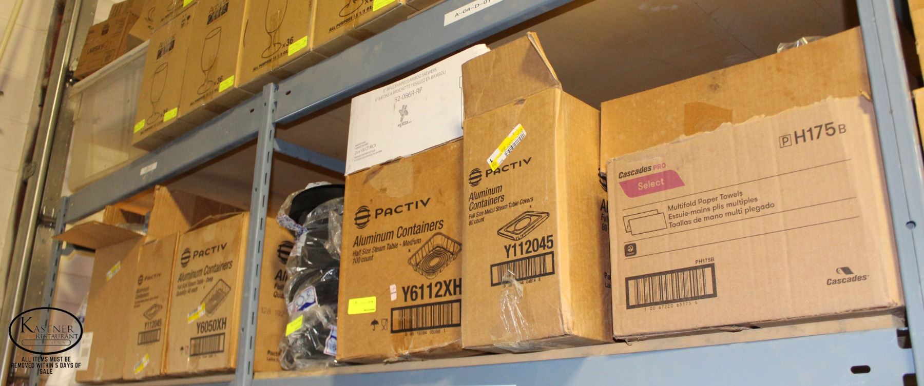 ALUMINUM STEAM TABLE PANS, PAPER TOWELS, BAMBOO SKEWERS & MORE (2 SHELF SECTIONS) **ALL ITEMS MUST BE REMOVED BY 5PM MONDAY, JULY 3RD, 2023. ALL REMAINING ITEMS WILL BE SUBJECT TO A $6.00 PER DAY STORAGE CHARGE. ANY ITEMS REMAINING AFTER MONDAY, JULY 17TH, 2023 WILL BE CONSIDERED FORFEITED. NO REFUNDS WILL BE ISSUED FOR FORFEITED ITEMS.** TO SCHEDULE A PICK UP APPOINTMENT CLICK HERE