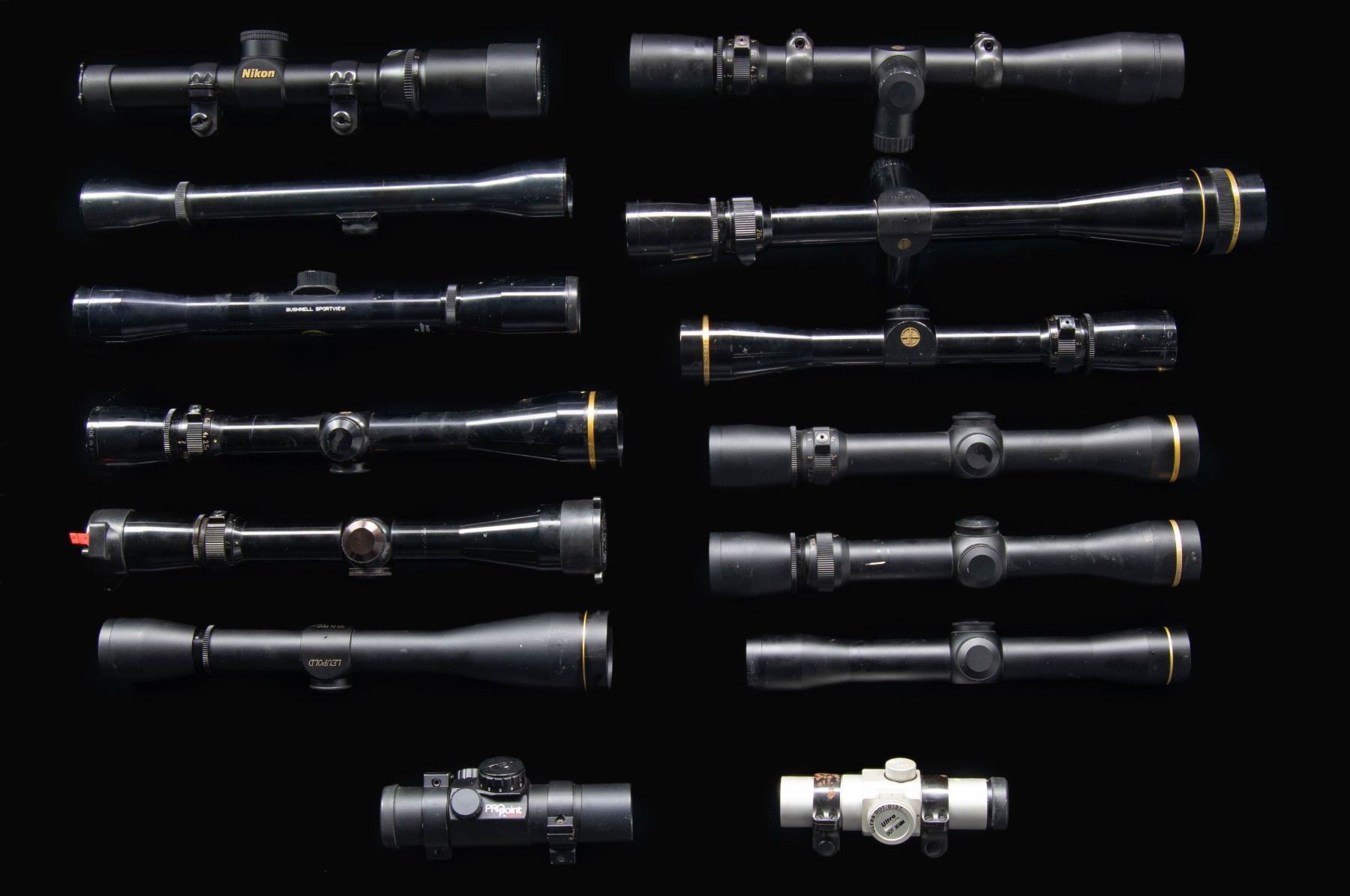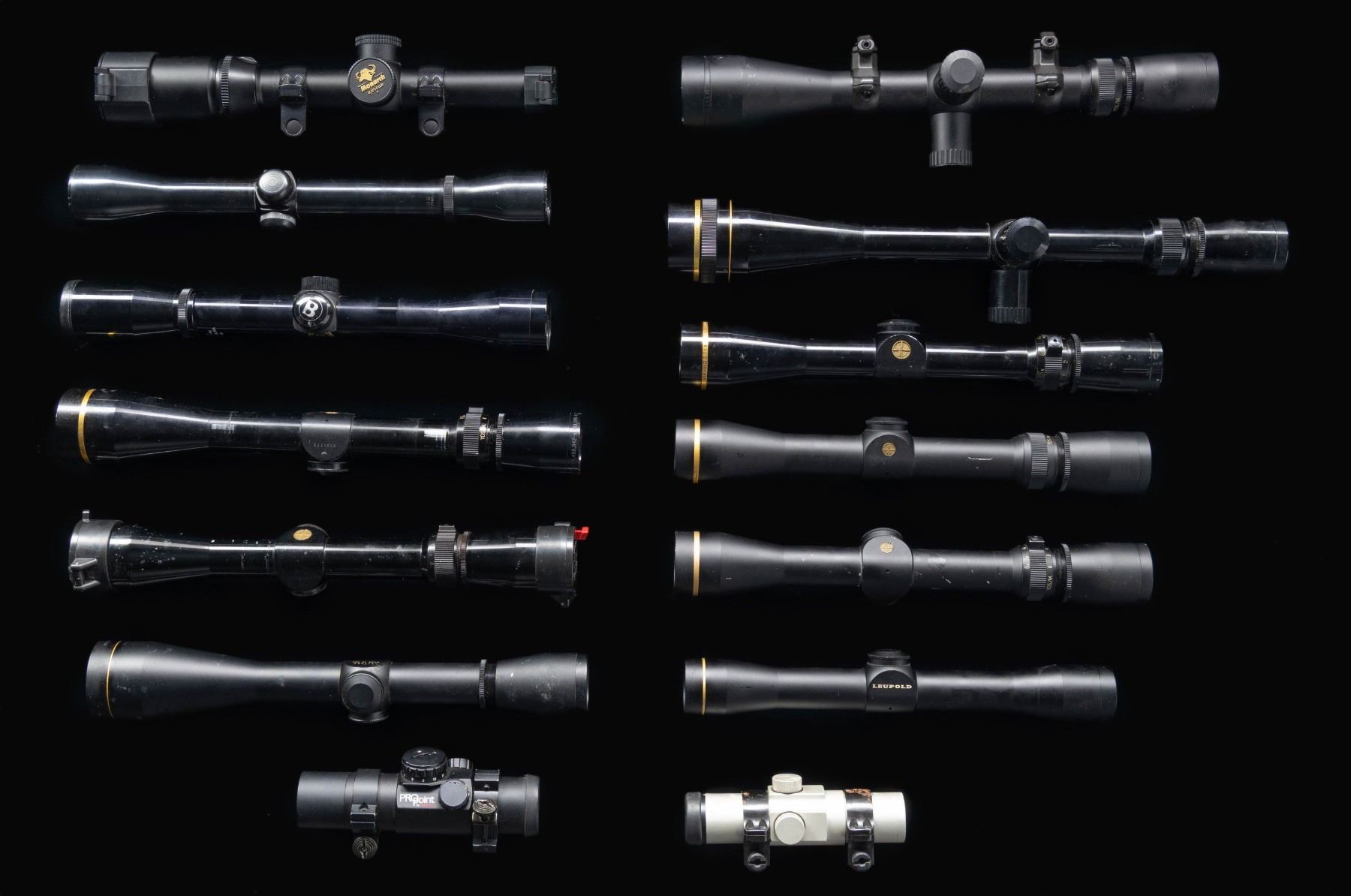 Large lot of assorted rifle scopes, including: 1) Nikon Monarch of Africa 1-4x20mm matte finished scope. 2) Leupold VARI-X III 3.5-10x gloss finished scope. 3) Leupold FX-II Scout 2.5x28mm matte finished scope. 4) Leupold M8 8x42mm scope. 5) Leupold VARI-X III 6.5-20 gloss finished scope. 6) Leupold VARI-X III 1.75-6x32mm matte finished scope. 7) Leupold VARI-X III 3.5-10 matte finished scope. 8) Leupold VARI-X III 2.5-8x gloss finished scope. 9) Leupold VARI-X III 2.5-8x gloss finished scope. 10) Leupold VARI-X III 1.75-6x32mm matte finished scope. 11) Bushnell Sportview 4x32mm gloss finished scope. 12) Weaver K4 60-B 4x fixed power blued steel scope. 13) Ultra Dot 30mm red sight sight. 14) Tasco ProPoint red dot sight. CONDITION: scopes retain the majority of their original factory finishes, showing scattered superficial handling marks and some spots of residue. Scopes retain clear optics. (02-25184/MLW). NON-GUN. $1,000-2,000.