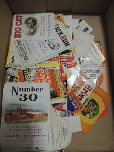 LARGE LOT OF BREWERIANA ASSORTED WHISKEY BOTTLE LABELS. TOO MANY TO COUNT. WIDE VARIETY. AS SHOWN. VIEW PICTURE FOR DETAIL.