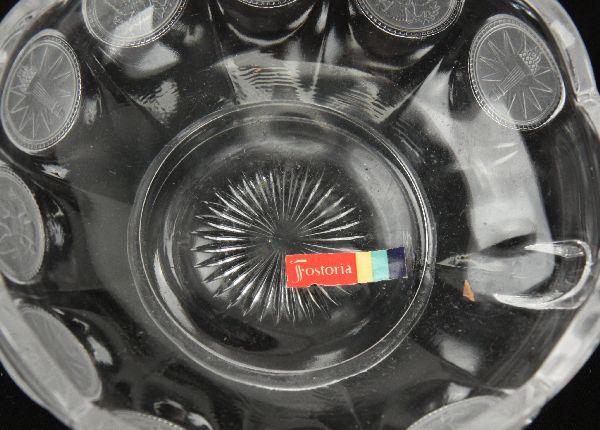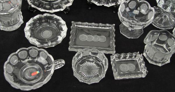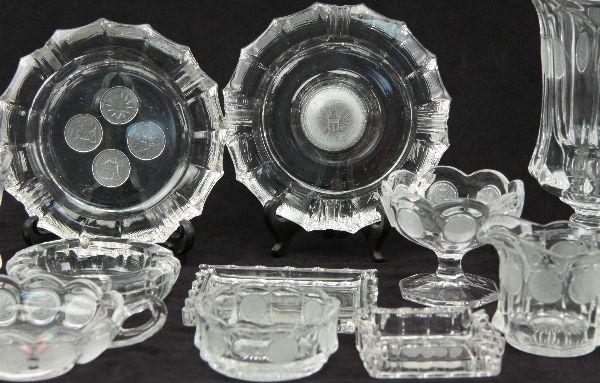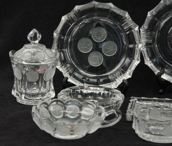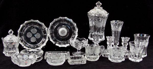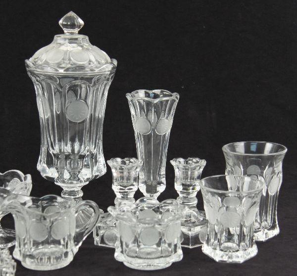39 pieces of clear Fostoria Coin pattern glassware. Pieces include: 3 inch creamer, 5.5 inch covered sugar dish, (2) 8 inch vases, (2) 4.5 inch candle holders, 3 inch cordial glass, (7) 4 inch tumblers, (14) 5.25 inch tall rocks glasses, a 13 inch covered