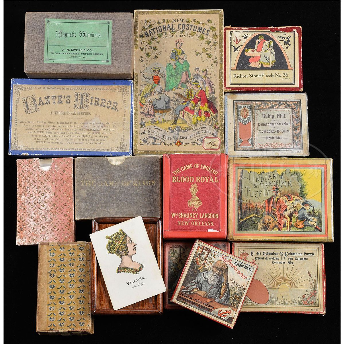1) "Game of English Royal Blood" by Langdon, New Orleans 2) "Magnetic Wonders" by Myers & Co., London 3) "Game of Europe" card game 4) "Dante's Mirror - A Fearful Freak in Optics" 5) "The Game of Kings" card game 6) "The Game of Sovereigns of England" by Jaques & Sons, London 7) Wooden Jacob's ladder trick puzzle by Wood & Sons, Baltimore 8) "Indian and Traveler" puzzle. Also included are five different boxed small stone block boxed puzzles - Germany. SIZE: Largest 6" l. PROVENANCE: The Diane and late Steve Olin collection. CONDITION: Averages good. 13271-25