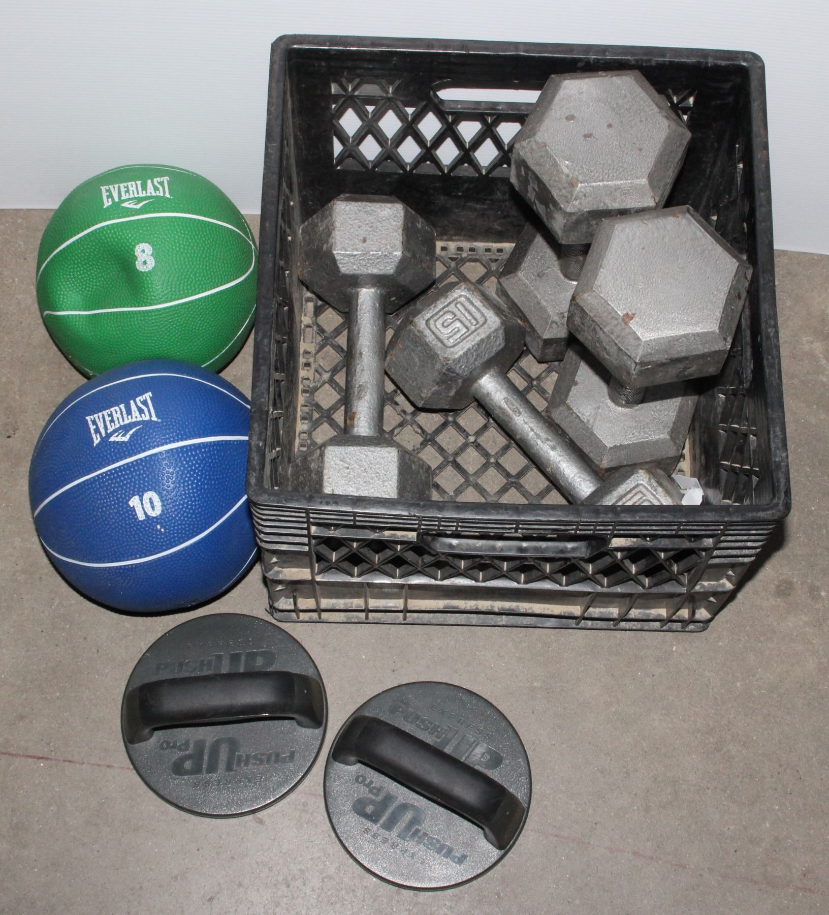 DUMBBELLS (TWO 15LB AND TWO 20LB), MEDICINE BALLS, IN A STORAGE CRATE