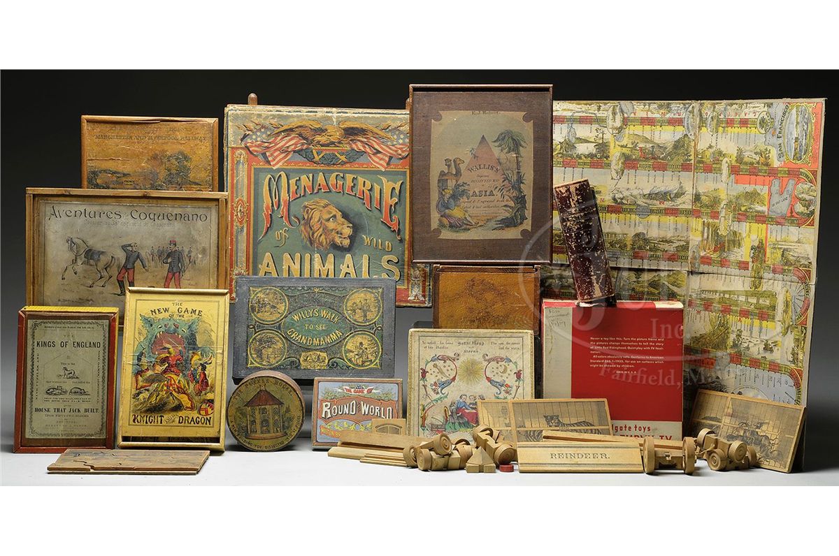 1) Crandall's Wooden Blocks with parts to make circus wagons. 2) Milton Bradley's game of "Round The World" with map and game pieces. 3) 1841 game of "Useful Knowledge" - London. 4) 1950s wooden toy "Topsy Turvy TV" in original box by Holgate USA. 5) A very nice McLoughlin Bros. "Menagerie of Wild Animals". Stone lithographed large images of wild animals scroll by. 6) 1822 "Dissected Map of Asia" paper on wood contained in sliding wooden box. 7) Early game of "Willy's Walk to See Grandmamma" with carved ivory and porcelain game pieces. 8) French "Adventures of the Conqueror" shows paper on wood jointed horse and rider with companion book. 9) Boxed English Parlor Billiards set. Includes everything to transform parlor table into a pool table. 10) 1872 hand painted game board featuring San Francisco by Thistleton. 11) Early German Galaxy boxed game board with hand painted box cover. 12) "The New Game of Knight and Dragon" boxed set circa 1840s. 13) 1830 paper on wood boxed puzzle of Locomotive engines by Wallis, London. 14) "The Puzzle House". 1800s wooden pieces construct round house. 15) "The Kings of England" and "The House That Jack Built" 1863 building blocks by Blakeman & Mason, N.Y. SIZE: Largest boxed game 13" l. PROVENANCE: The Diane and late Steve Olin collection. CONDITION: Fair to very good. 13271-28
