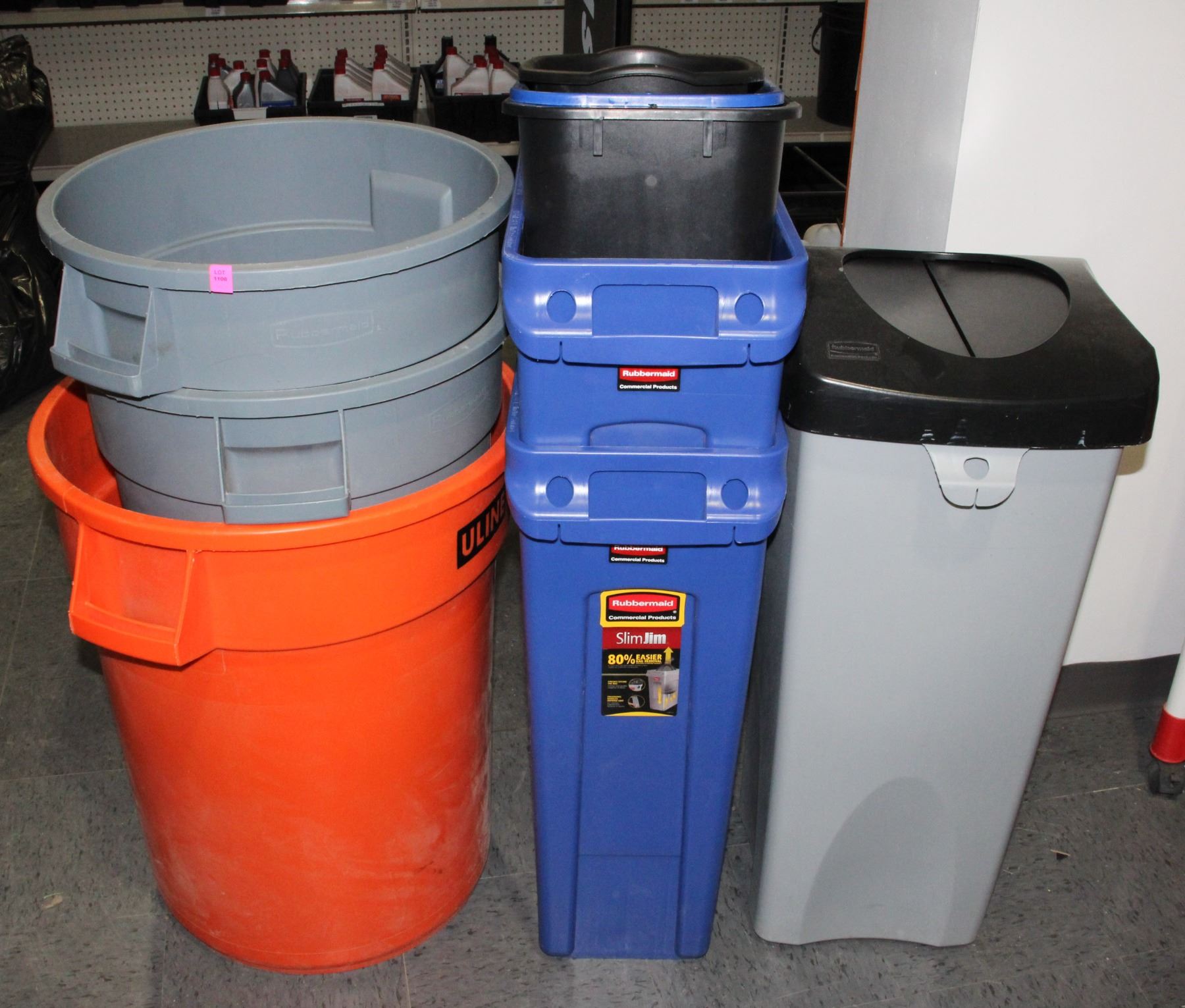 LARGE LOT OF GARBAGE CANS, RECYCLING CANS