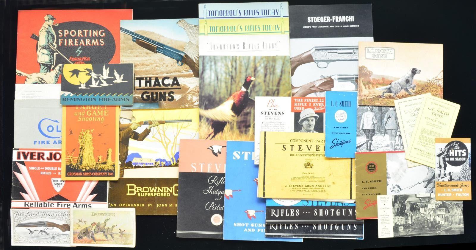 FROM THE ESTATE OF NORRIS MORGAN. Approx. 10 manilla folders labeled for: Parker (2 "The Parker Gun" w/ 1938 retail price list, Larry Del Grego 1937 price list, "Gray Goose" Parker guns catalog & 4-5 Remington/Parker bits of advertising & correspondence), Browning (1939 pricelist, lg. catalog "Browning Superposed" 3 1/2" x 6" Browning catalog), Ithaca Gun Company (1939 pricelist, 9" x 11" "Ithaca Guns" catalog w/ grouse on cover, & a sm. "Ithaca guns" catalog), Remington (lg. orange & black "Sporting Firearms", 4" x 7" "Remington Firearms" catalog), Sedgely ("The Sedgely Handbook Catalog #48" & 3 1/2" x 6 1/4" "R. S. Sedgely Inc."), L. C. Smith (pre-war "L.C. Smith Guns" 6" x 8" w/ pointing dog & 6X8 "Golden Anniversary" 1939 & 1941 catalog, w/ other leaflets & pricelists), Mannlicher Schoenaur (1956 listing, circa. 1961 leaflet). Stoger's, pertaining to rifle blanks & Franchi shotguns. 7 Stevens catalogs & pricelists from the '30s-'40s. Weatherby, 3 different "Tomorrow's Rifles Today" 8823 Long Beach Blvd. address, 1 blue, 1 yellow & 1 gloss white. Lg. amount of paperwork regarding Winchester & Remington trap machines & another folder on scopes (Weaver, Sears, Redfield). In addition, loose: "Colt Firearms", "Crossman", "Iver Johnson", & late '50s vintage "Krieghoff". CONDITION: good-fine. (02-13884/MGM84). $1,000-1,500.