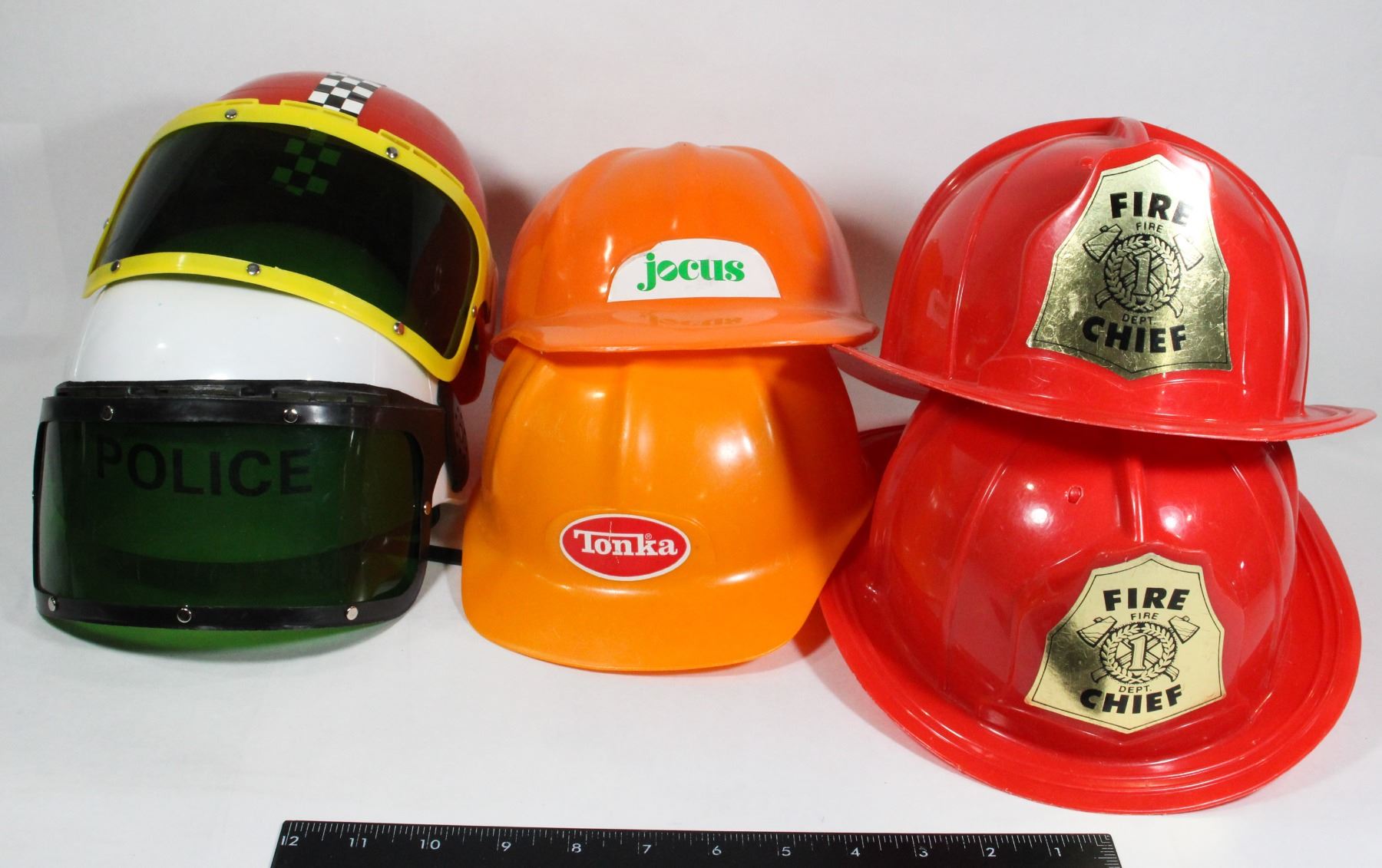 A TONKA HAT, FIREFIGHTER HATS, AND OTHERS