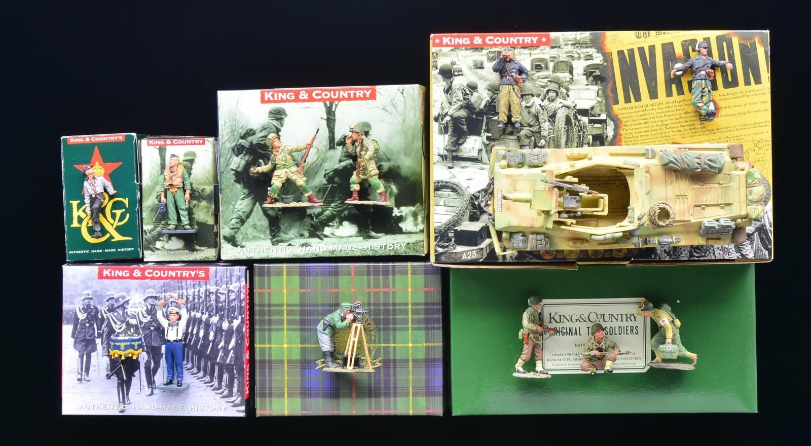 This lot consists of approximately 58 boxed King & Country WW2 pieces. All appear to WW2 themed & most are American or German. Notable among the terrain pieces are Hitler's 1945 bunker, a barbed wire piece & an oil drum piece. Notable among the figurines are several American infantrymen, Waffen SS soldiers & Berlin '38 figures. Notable among the vehicles are Michael Whttmann's Last Tiger, Kurt Meyer's Command Half Track, a 75mm Sherman tank, Normandy Panther tank, Dodge WC52, M5A1 Stuart, a US medical jeep, Puma armored car, German 39(H) 10.5 CM self propelled gun, a King Tiger tank, Kriegsmarine BMW 327 car, M21 Mortar Carrier half track & a Stug IV w/ a bent bbl. Some boxes show wear & tears. Some small pieces maybe missing. The items are overall good to very good. (02-16455-2/MJC). $600-800.