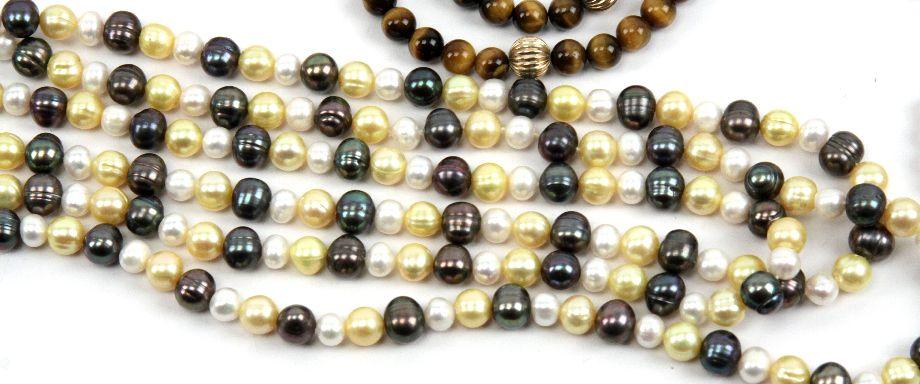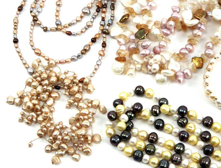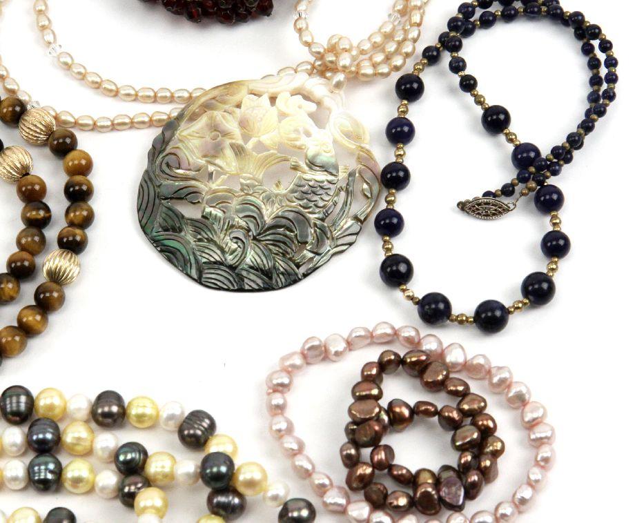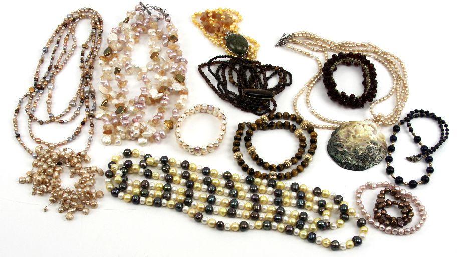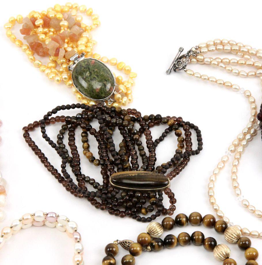 A fabulous grouping of pearl and natural stone jewelry, including: (4) pearl bracelets, (3) stone bracelets, an 18 inch cats eye bead necklace, an 18 inch lapis bead necklace, and (4) pearl necklaces. Condition: Very good