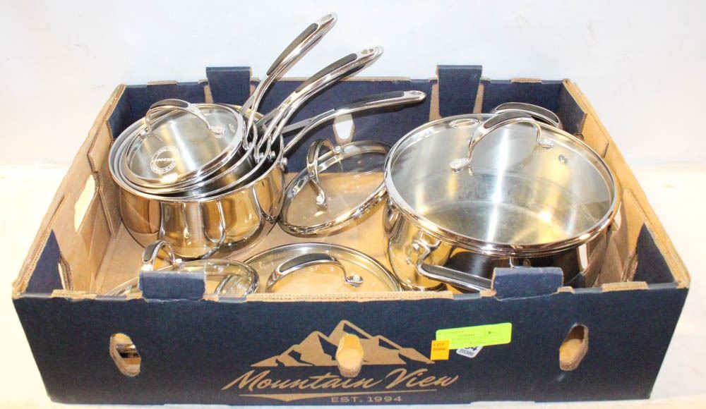 LARGE LOT OF LIGHTY USED LANGOSTINA POTS & LIDS