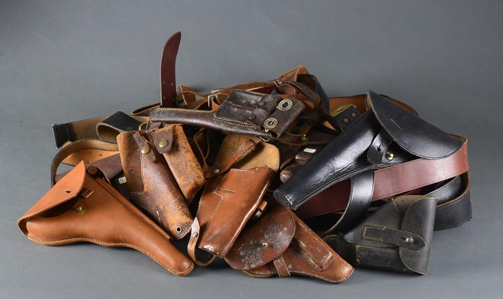 MORE. This exceptionally lg. lot includes, but is not limited to, over 80 military belts from various countries & of various ages. Materials vary from leather to brocaded German belts. There are many East German examples w/ buckles. There is a variety of holsters from several different periods, mostly of leather. Also included are 3 pairs of East German Army boots in original issue boxes. CONDITION: many of the above items are unissued & show only storage wear. Some holsters show light to moderate wear. Boots are unissued. (02-13538/BF). $400-700.