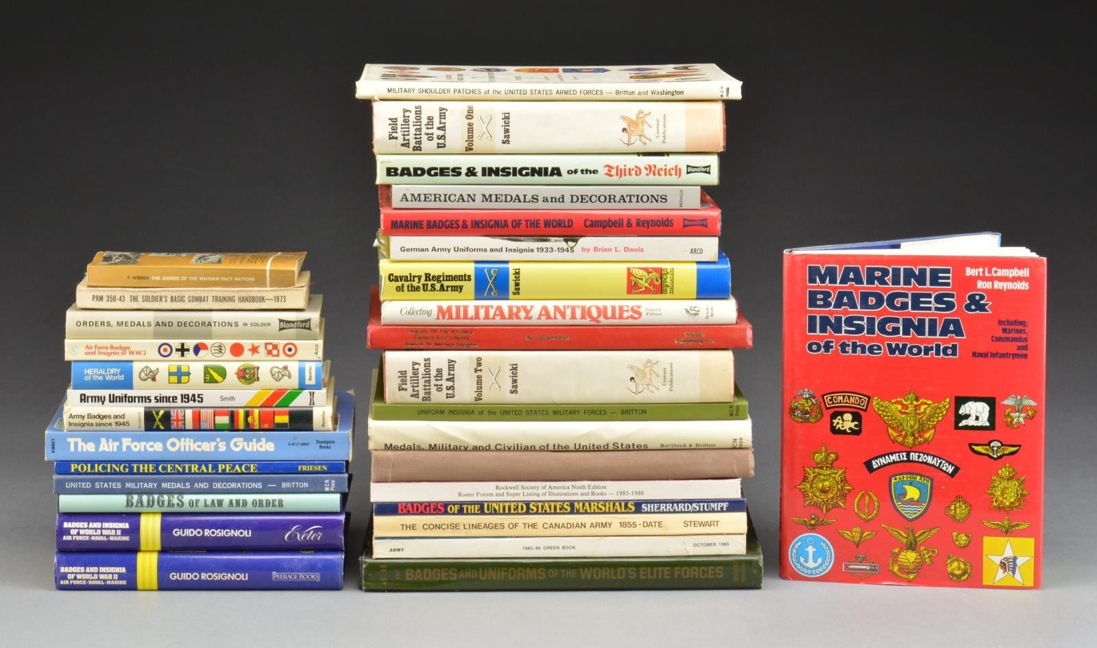 This lg. lot of approx. 50 books addresses a wide variety of military collecting & research areas. Some are quite hard to find today. Titles include but are not limited to: “The Concise Lineages of the Canadian Army 1855-Date”. / “Badges & Insignia of the Third Reich 1933-45”. / 3 Volume set of “The Comprehensive Illustrated Guide to United States Airforce Pocket/Shoulder Insignia”. / “Maine Badges & Insignia of the World”. / “American Medals & Decorations”. / “Cavalry Regiments of the U.S. Army”. / “German Army Uniforms and Insignia 1933-1945”. CONDITION: all books are in good useable condition. (02-14045/BF). $200-400.