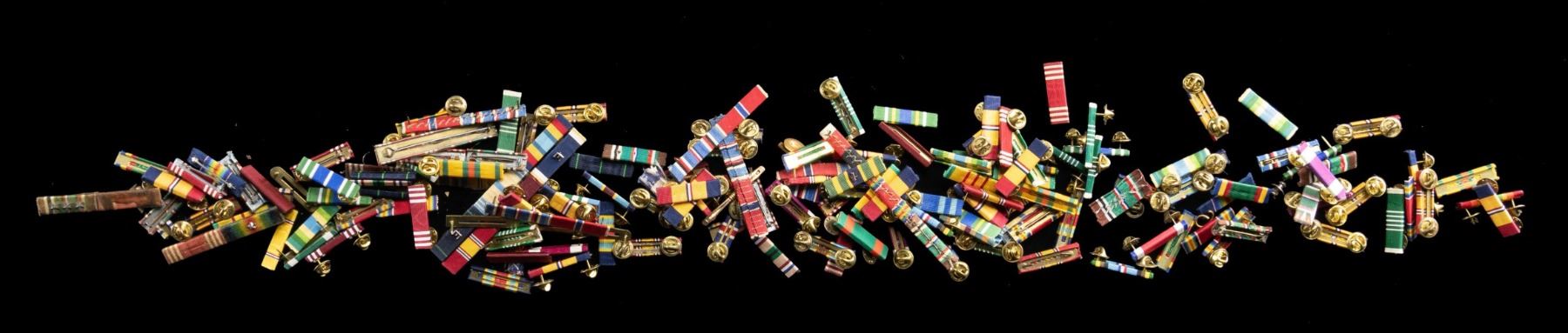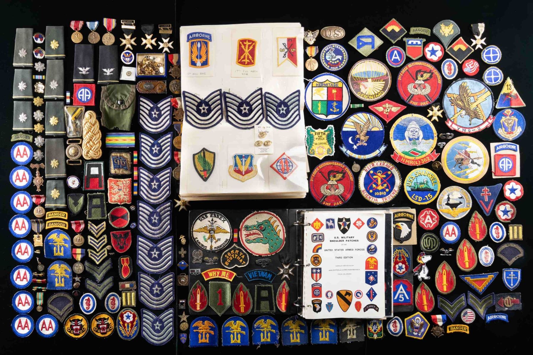 This lot consists of the following items: 1) About 250 mostly US military patches. Highlights include 1st Force Recon Company Pacific, 82nd Airborne, 101st Airborne, 7th Cav, 1st Special Operations Command & 1st Armored Division. Several patches are non-military such as flight schools, state organizations & one Playboy Bunny patch. 2) Three large zip-lock bags containing varied military pins, ribbons & badges. 3) A binder containing information on varied patches. CONDITION: patches show varying degrees of staining & age related wear. Other items show varying age wear. (02-24173-1/MJC). $300-500 for lot.