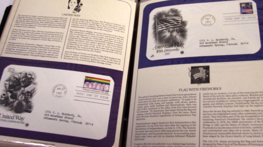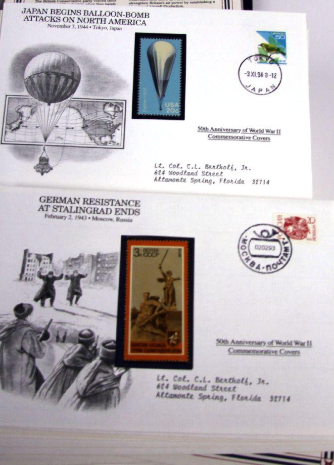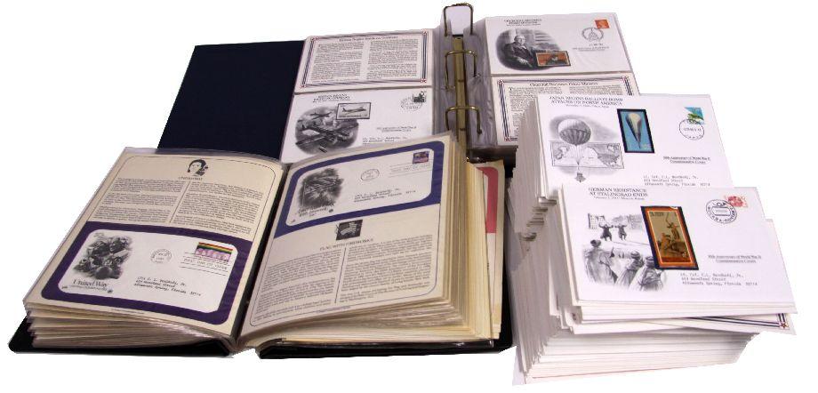 A large collection of US postal first day cover stamps, including 50th Anniversary WWII commemorative cover collection binder, art and aviation themes, and more.
