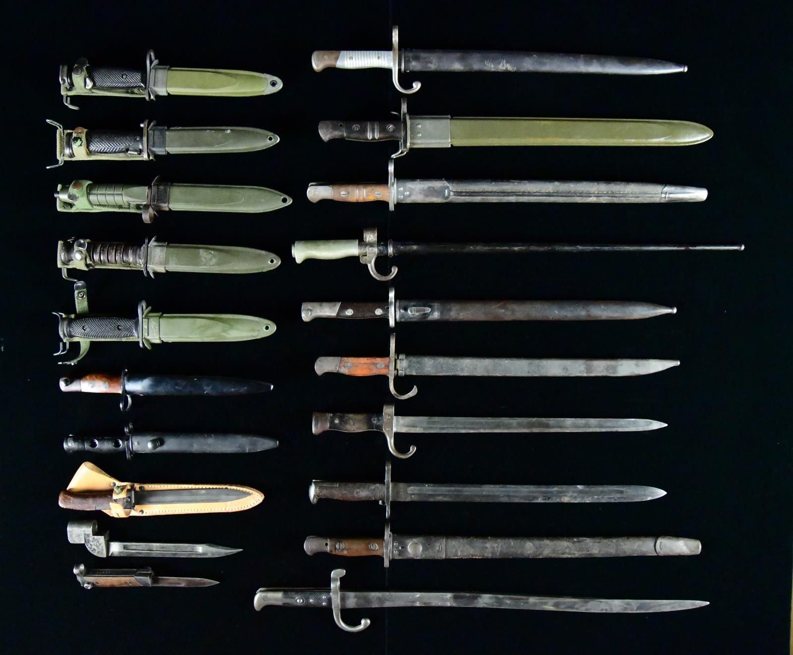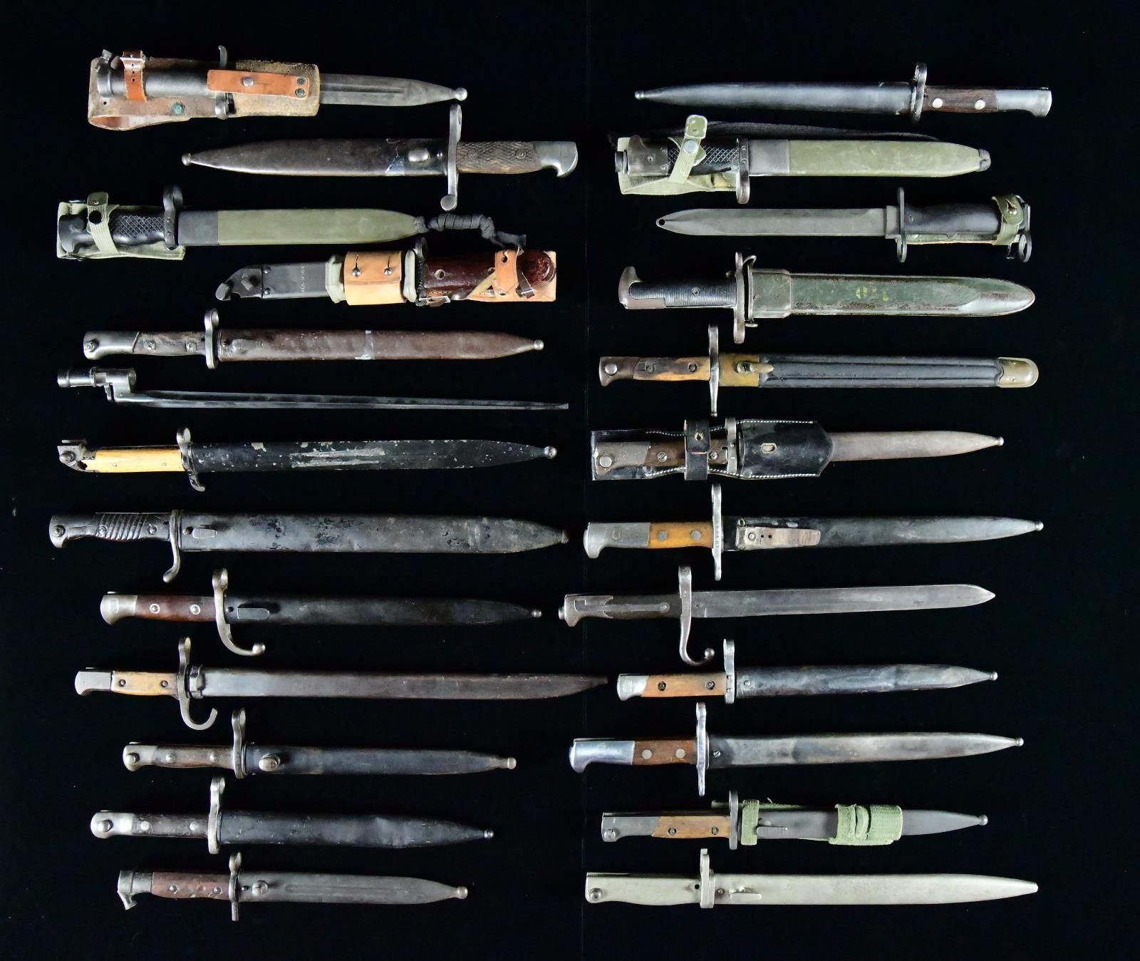 This lot consists of the following bayonets: 1. Japanese Type 30 bayonet w/ scabbard. Hooked quillon model w/ blued blade made by an unknown Kokura subcontractor. 2. US M1905 Bayonet. No scabbard present. Springfield Armory mfg. w/ parkerized finish & wooden handles.3. German 98/05 Butcher Blade Bayonet w/ scabbard. Mfg. by Deutsche Maschinenfabrik AG Disburg in 1917. Arsenal rework blue finish. 4. Soviet 91/30 Mosin Nagant Bayonet. No scabbard present. Arsenal blue finish. 5. RFI No. 5 Jungle Carbine w/ scabbard. Ishapore made Jungle Carbine bayonet w/ blued finish. 6 & 7. Spanish CETME Bayonets w/ scabbards & frogs. Parkerized finish w/ Spanish coat of arms on blade. 8. Czech VZ58 Bayonet w/ scabbard. Parkerized finish. 9. US M1905 Bayonet w/ scabbard. Mfg. by UFH in 1942 & appears to be arsenal cutdown from a M1905 model. Bayonet has worn parkerized finish. 10. Swedish M1914 Bayonet w/ scabbard. Scabbard & metal parts of bayonet have flaking black enamel. Grips have replacement screws, added varnish w/ some chipping wood & some cracks. 11. British L1A3 Bayonet w/ scabbard. Black enamel finish. 12. US M5 Bayonet w/ M8A1 bayonet & frog. Milpar made bayonet w/ bright blade. 13. Romanian AK47 Bayonet w/ matching numbered scabbard & frog. Parkerized finish. 14. British P13 Bayonet w/ scabbard. Made by Winchester & dated 12-16. 15. French 1886 Lebel bayonet w/ mismatched scabbard. 16. Argentine 1891 bayonet w/ matching scabbard. Aluminum handles & bayonet is frozen in scabbard unable to see blade marks or if crest is intact. 17. Swedish M96 bayonet w/ scabbard & frog. 18. US M3 Fighting Knife w/ M8A1 scabbard & frog. Crossguard marked Camillus M3 fighting knife w/ leather handles. 19. US M1917 Bayonet w/ scabbard. Remington made M1917 bayonet dated 1918. Metal shows scattered pitting & oxidation. 20. G3 style bayonet w/ US M8A1 scabbard & frog. Bayonet appears to be an unmarked Norwegian AG3 type w/ parkerized finish & green handles. 21. US M7 bayonet w/ M8A1 scabbard & frog. Crossguard has BOC marker marking. Parkerized finish w/ checkered black handles. 22. US M4 bayonet w/ M8A1 scabbard & frog. Crossguard has AKI makers marking. Black handles & parkerized finish. 23. Egyptian Hakim Bayonet w/ scabbard. Blade has a two-tone appearance. Metal parts of bayonet & scabbard show scattered oxidation. 24. Unmarked German Ersatz style bayonet w/ scabbard. Plated finish w/ scattered oxidation & pitting. 25. British P1907 bayonet w/ scabbard. Sanderson made & 1918 dated P1907 bayonet. Metal parts of bayonet show scattered oxidation. 26. French MAS 49/56 Bayonet w/ scabbard & frog. Crossguard marked "MAT/F". Parkerized finish. 27. M1891 Carcano bayonet w/ leather scabbard. Blade has added electric pencil marking & metal shows scattered pitting. 28. Yugo M1948 bayonet w/ mismatched scabbard. Blade marked "PREDUZECE 44". Blued finish & hardwood handles. 29. Swiss M1899 bayonet w/ scabbard .Brightly finished metal w/ Neuhausen maker's marking. 30. FN49 Bayonet w/ scabbard. Parkerized finish w/ circled "M" & "SA30" markings. 31. Italian M1938 folding bayonet. Blue finish. Rear numbered "66377". 32. Swiss M1899 Bayonet w/ scabbard. Bayonet has Elsener Schwyz maker's marking, hardwood handles & bright finish. 33. Japanese Type 30 Bayonet w/ scabbard. Brightly finished Japanese Type 30 bayonet w/ bright finish, Kokura/Tokyo arsenal symbol & hooked quillon. Metal parts of bayonet show scattered oxidation. 34. French 1892 Berthier bayonet. No scabbard present. Wooden handles show cracks & chipping. Metal is turning gray w/ scattered oxidation & pitting. 35. Hungarian M1895 bayonet w/ scabbard. Maker marked by FGGY & crossguard has electropencil number. Hardwood handles. 36. Spanish M1941 Knife Bayonet w/ scabbard. Blade has Toledo arsenal marking. Metal parts of bayonet appear cleaned w/ pitting. 37. Czech VZ22 bayonet w/ scabbard & frog. Blade has CSZ marking & 1923 Czech acceptance stamp. Blade measures about 8 3/4". 38. British No. 9 MkI bayonet. No scabbard present & Suncorite finish has mostly flaked off. 39. Chilean M1895 bayonet w/ matching numbered scabbard. Bayonet & scabbard both numbered "F3384". Blade is maker marked by Weyersberg & Kirchbaum. Bayonet has faded blue finish & grips appear sanded. 40. Alex Coppel Saber Bayonet. No scabbard present & bayonet appears to be for a Chassepot or Gras. Brightly finished metal & checkered black rubber handles. 41. Italian 1870 Vetterli Bayonet. No scabbard present. Blade shortened to about 12" & marked w/ crown "TA" marking. Hardwood handles. Metal is mostly gray patina w/ oxidation. 42. Turkish M1935 Bayonet w/ scabbard. Pommel marked "ASFA" & "4274". Bayonet has bright finish w/ scattered dings & oxidation. Grips show some carvings & dings. Scabbard has black enamel finish & large dented areas. 43. Unmarked Bayonet w/ scabbard. Rear of pommel number "28050". Bayonet otherwise appears unmarked. Bayonet measures 17 3/4" overall w/ 12 3/4" blade. Blade has bright finish that appears cleaned w/ scattered oxidation. Hardwood handles show large chips & gouges. Scabbard turning gray w/ dents & oxidation. 44. Unmarked Bayonet w/ scabbard. Right side of pommel numbered "0335-R". Bayonet otherwise appears unmarked. Hardwood grip panels show scattered dings & chipping. Bayonet & scabbard show scattered oxidation & some pitting. 45. Unmarked Bayonet w/ scabbard. Bayonet appears to be a short Belgian 1889 bayonet or Brazilian 1908 bayonet w/ hooked quillon. Brightly finished metal that has turned gray w/ oxidation. CONDITION: items vary from fair to very good plus w/ oxidation, dings & gouges. (02-22472/MJC). $500-1000.