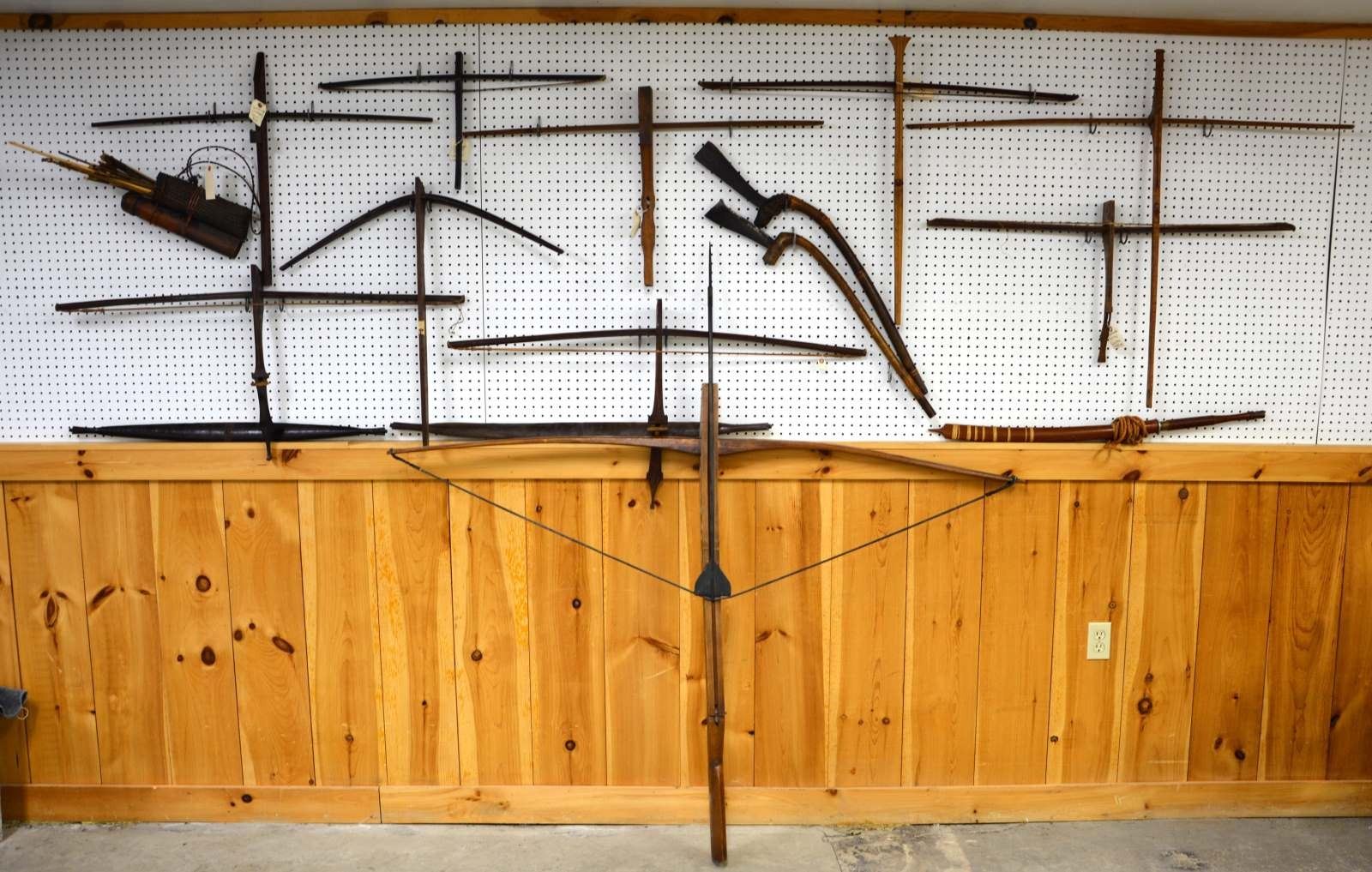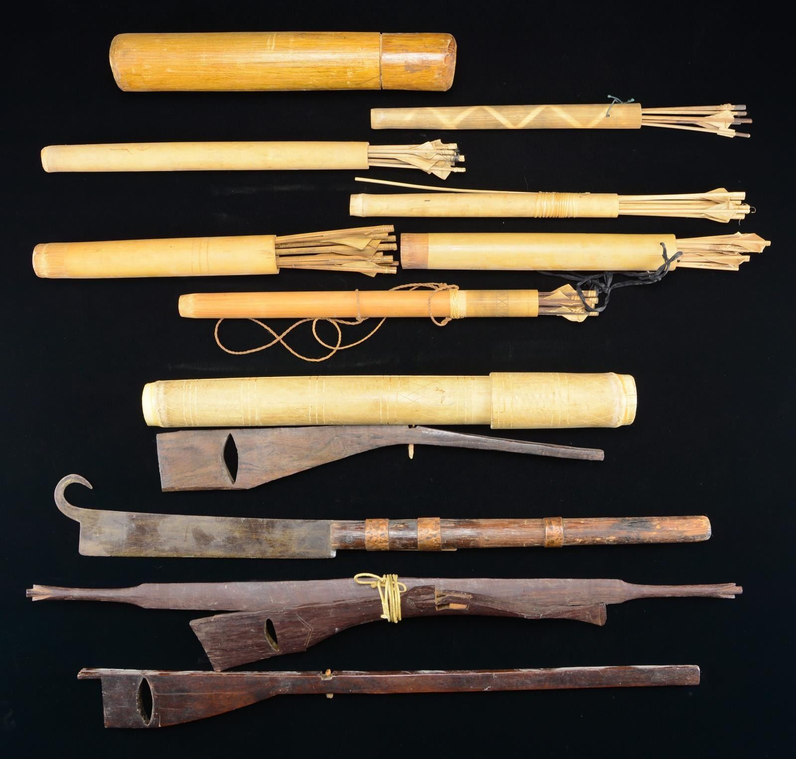 WEAPONS. This exceptional lot includes 1 particularly large Montagnard crossbow with a 72” wide bow & a 52 1/2" body. The arrow that this shoots is 39” long & iron tipped. / 12 Montagnard crossbows with bows measuring between 32” & 46” long, and bodies measuring between 15” & 39” long. / 10 Montagnard quivers ranging in size from 11” in length to 23” in length. The quivers contain dozens of original Montagnard arrows. / 1 Montagnard sword with an overall length of 39” & a blade length of 23”. / 3 Montagnard battle axes, known as “mak”. These weapons were used throughout Southeast Asia & were favored by the Montagnard & Thai warriors. Size measures between 31" & 37 1/2" long. CONDITION: all weapons generally show light wear & remain in good, functional condition. Wood & metal parts have a pleasing aged patina. PROVENANCE: from the Lifelong Collection of Glen E. Mattox. (02-18683/BF). $1,500-2,500.