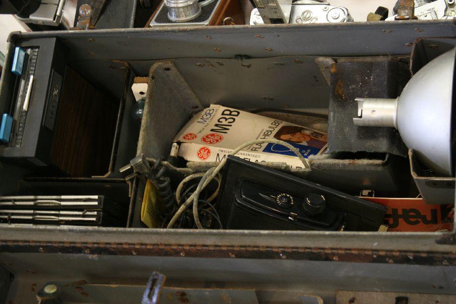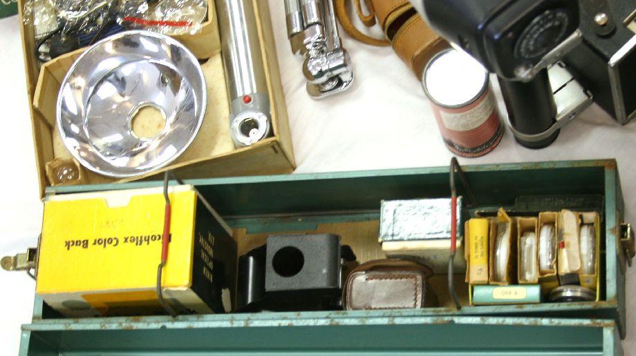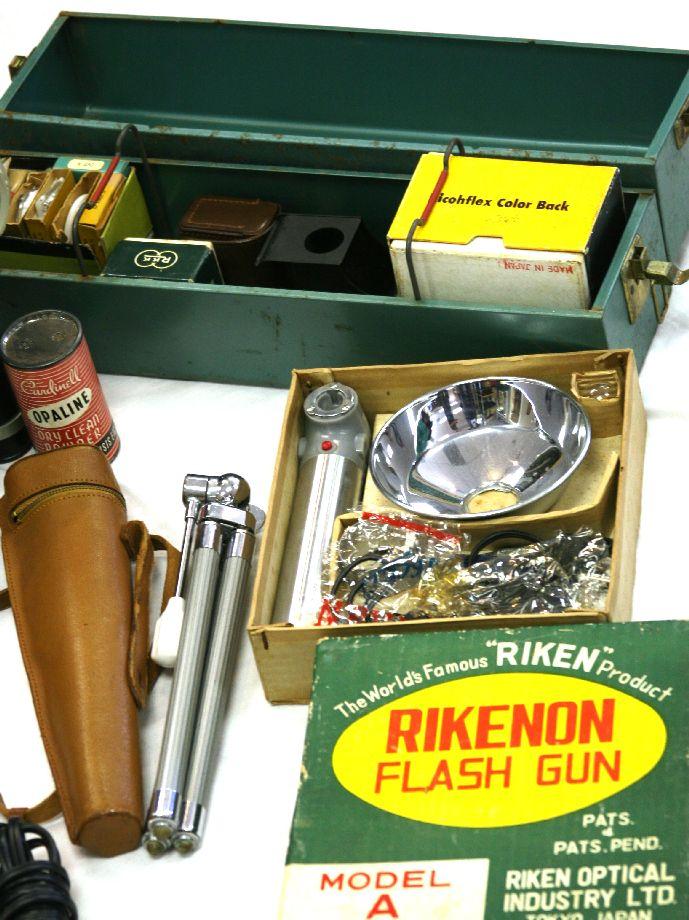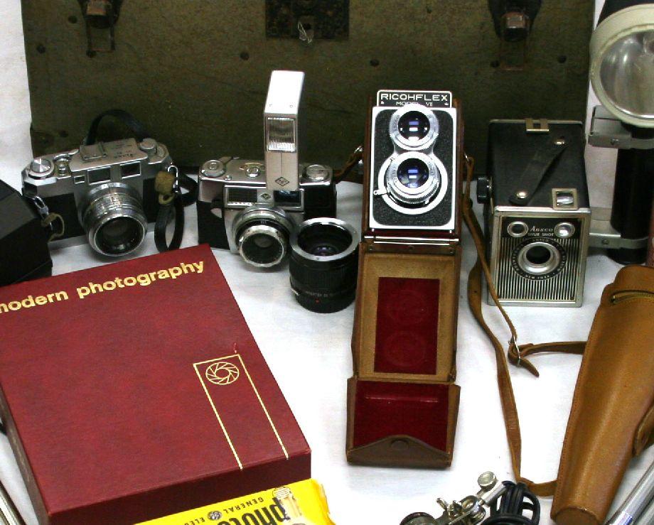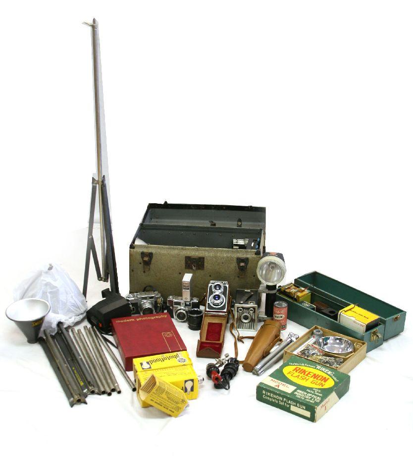 A vintage lot of camera gear to include: AGFA Color Optima Ia 1.28/45 camera, Polaroid OneStep Flach camera, Ricohflex Model VII 1.35/8 camera with case, Ansco Shur Shot camera, Aires 35-IIIL 4.5 cm camera, Soligor Auto Tele converter 3X lens to fit OM-1, Rikenon Flash gun in box, a Singer Graflex strob 250, a Modern Photography boxed instructional set, tripod, studio light set, Proxar Rocoh-PX- No. 1 36mm lens set, Konihood lens hood, Riken 36mm lens hood, Manon self timer, (4) Koni filters for Konica F2 (Y1, YR, R2, UV), Kenko black and white filter, Wal-Filter for color film, Konishiroku (Konifilter), Ricohflex color back (boxed w/papers), another color back, 4 Graflex graphic film holders, "22" Graphic 120 roll holder 4 x 5 graphics, Graflite flash equipment (wth guidebook), (9) M3B flashbulbs with box, and a Polaroid film holder. Also included are two vintage carrying cases (in fair condition).