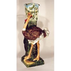LARGE MAJOLICA OSTRICH FIGURED VASE, late 19th century, colorfully decorated, modeled as an ostrich standing by a tall narrow vase, the exterior resembling a stand of flowers and plants; 32-1/2 height
