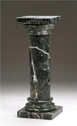 LARGE MARBLE PEDESTAL. Square top on a round column with square base. A black granite with white veins. Made in five pieces for easy transport. SIZE: 35-1/2in. h. Top is 14in. sq. CONDITION: Very good. 9-26173
