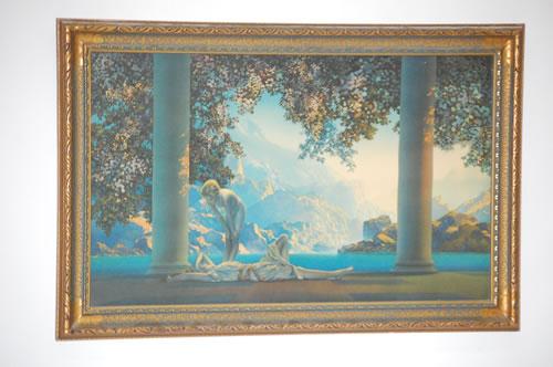 LARGE MAXFIELD PARRISH PRINT - EARLY 20TH CENT. MAXFIELD PARRISH PRINT "DAYBREAK" IN ORIGINAL BLUE & GILT HOUSE OF ART FRAME (17 1/2" X 29 1/2"-SIGHT SIZE) GOOD COLOR, MINOR TONING & WEAR TO FRAME