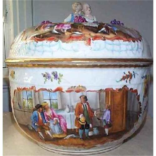 A STUNNING MEISSEN TUREEN OF GRAND PROPORTIONS AND QUALITY; ENCRUSTED GRAPES, LEAVES AND VINES SURMOUNTED WITH FIGURES OF A YOUNG BOY AND GIRL. TWO DIFFERENT WATTEAU STYLE SCENES ALONG WITH FLORAL SPRAYS FURTHER ENCHANCE THE HEAVILY GILDED UN-NOTCHED COVER. THE BODY ITSELF FEATURES ANOTHER 2 DIFFERENT WATTEAU TYPE SCENES, WITH FLORAL SPRAYS, AND HEAVILY GILDED RIM. MARKED WITH CROSSED SWORDS IN UNDERGLAZE BLUE, DATING THIS INCREDIBLE PIECE TO 1850-1870. STANDS 10" TALL WITH A DIAMETER OF 9.75"...WEIGHS ABOUT 7.5LBS. A LARGE PIECE! CONDITION: LID HAS 2 FAIR SIZED CHIPS(see photos) AND LIGHT CHIPPING TO THE ENCRUSTED LEAVES. THERE IS RESTORATION TO THE BODY AND ANOTHER CRACK APPEARING(again, see photos). A VERY GRAND PIECE HOWEVER, CERTAINLY WORTHY OF PROFFESSIONAL RESTORATION. I WILL GLADLY SEND ADDITIONAL PHOTOS ON REQUEST.